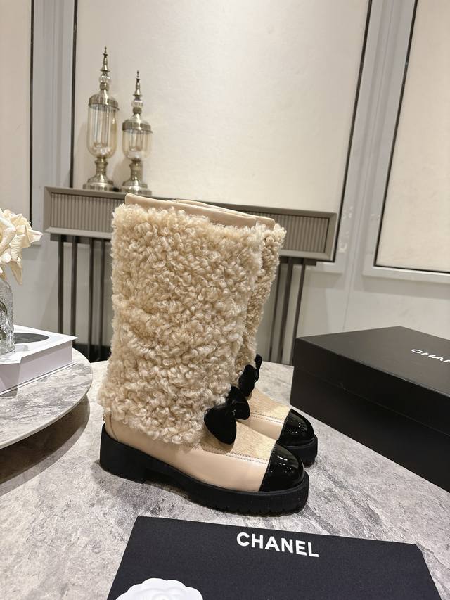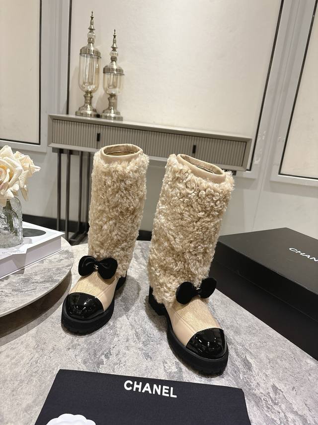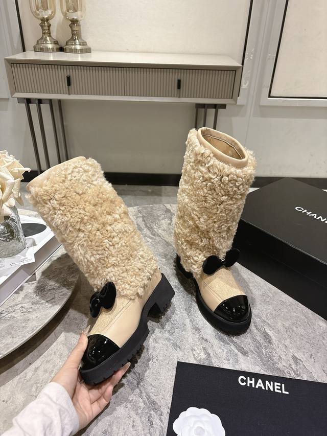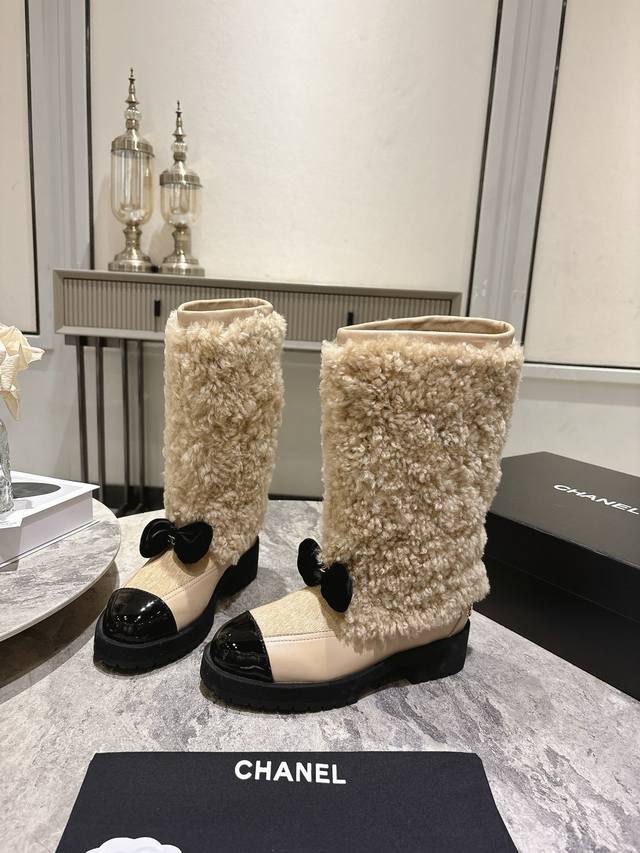 Chanel 小香 25秋冬新品 专柜经典走秀款 小香双C蝴蝶结拼色毛毛长靴 系列上新 DDD Bs时尚圈的绝绝子 搭配将演绎着细致 极简 永不褪去的经典元素 展现与众不同的穿搭风格美到无话可说 夏季必入款 DDD 鞋面:高定制原版小羊皮拼接羊毛 DDD 内里:进口丝绸羊皮里 DDD 大底:原版开模定制防滑大底 DDD 跟高:4.5Cm DDD 鞋码: 35-39 40.41定制不退换 DDD