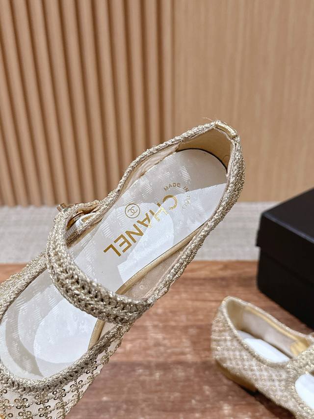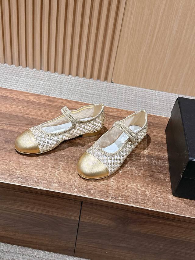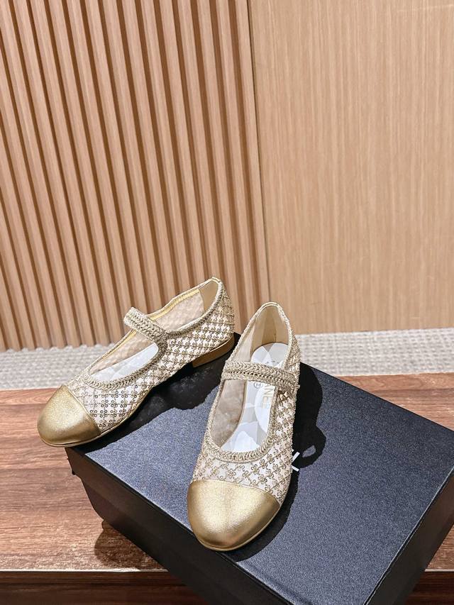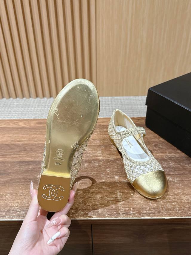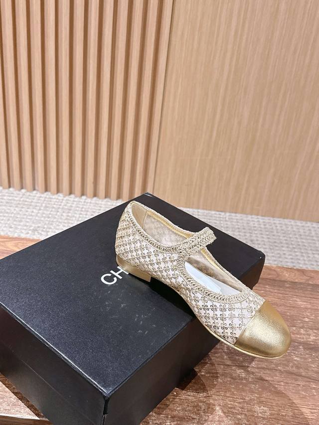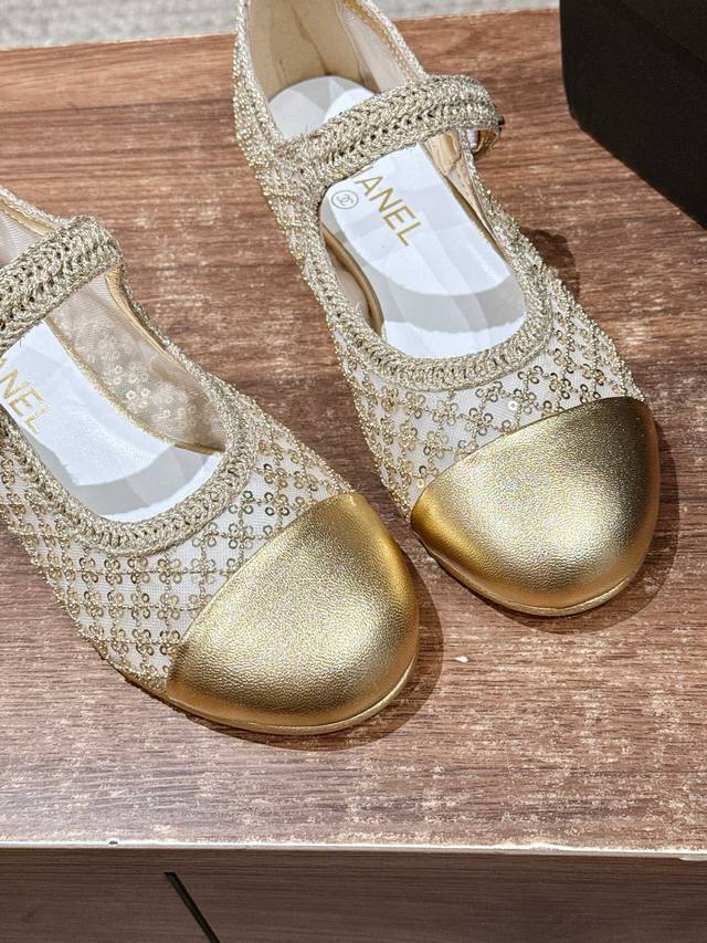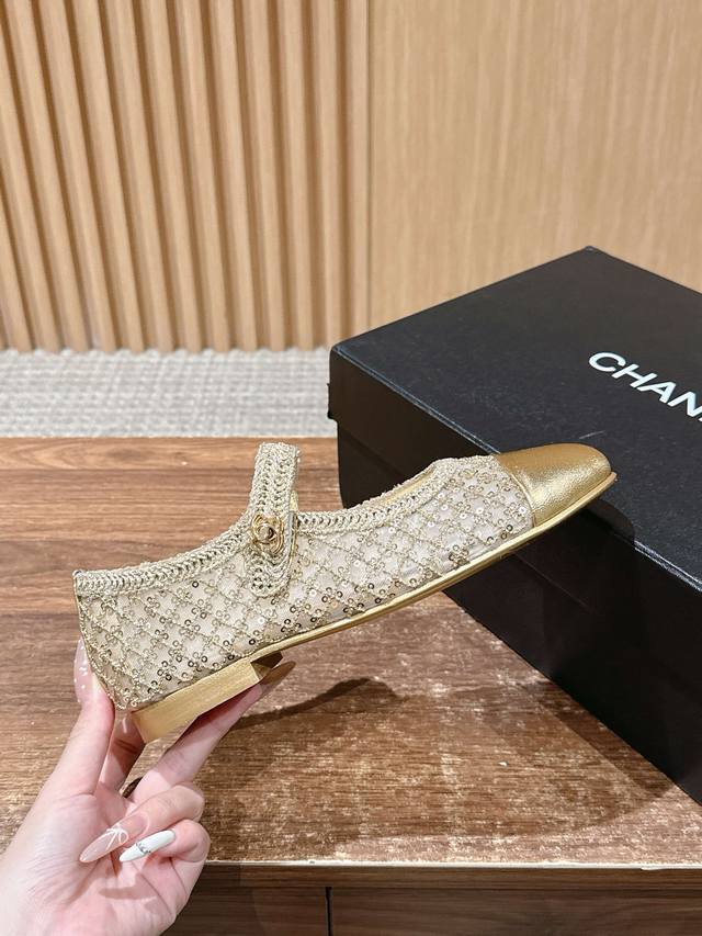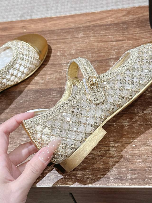 Chanel 香奈儿新款玛丽珍平底鞋 金色亮片芭蕾鞋精致优雅 闪闪的贵气感 好看又好穿 特定珠片网纱材质 真皮大底 Size:35~40 40定制不退换