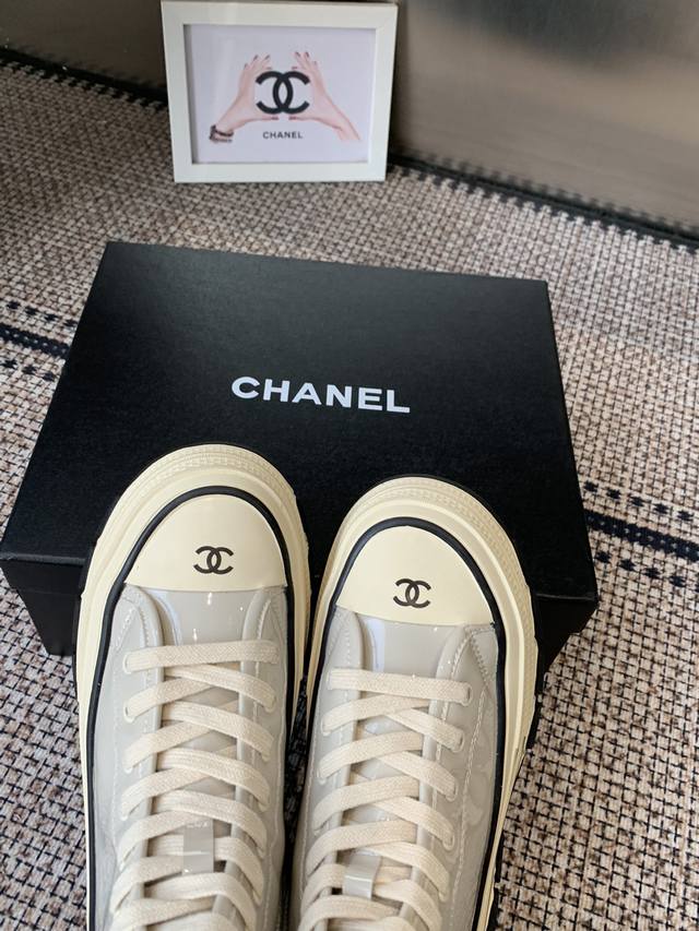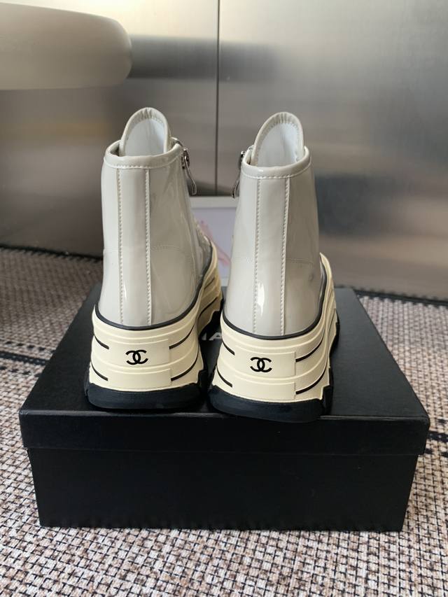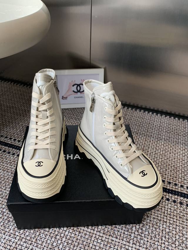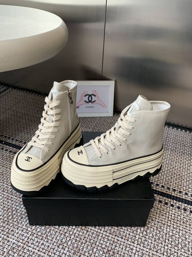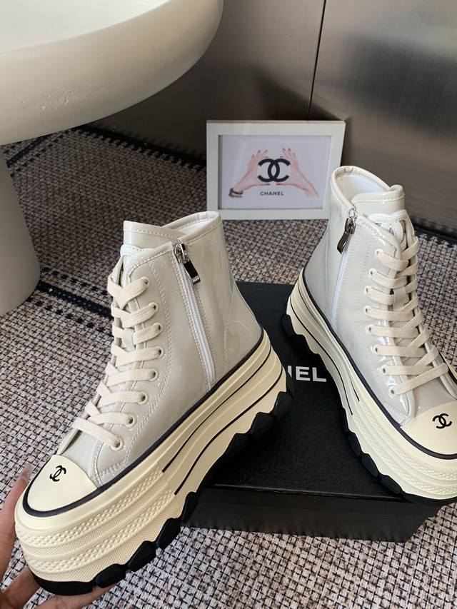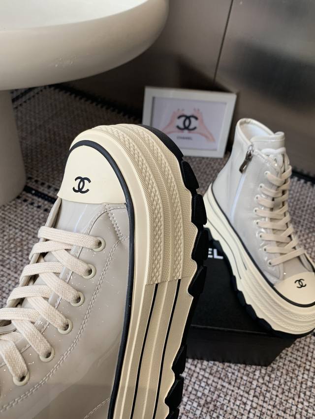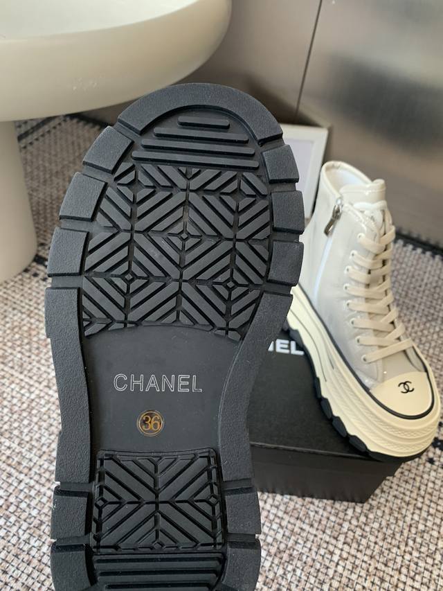 Chanel 香奈儿 秋冬新款 厚底 高帮休闲鞋 小白鞋 Vintage感满满 中古复刻款Get啦~小白鞋适配黑白拼接就很Chanel 配合袜子就很复古学院的感