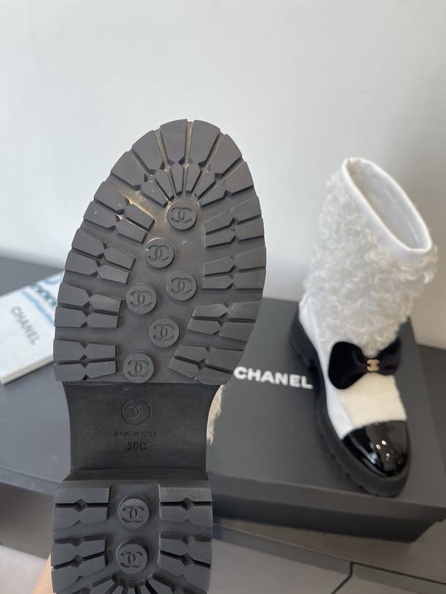 Chanel 香奈儿 25N滑雪系列蝴蝶结 羊羔毛短靴 DDD 超多明星网红种草 可帅气可温柔的小香靴子 蝴蝶结也是它家的一个很经典的元素 搭配羊毛靴筒 设计真的绝绝子 看起来就是不一般的短靴。靴筒笔直有型且不失柔软度 也不挑人 加上精致Logo点缀 高级大气 不俗气 上脚酷酷的特有范儿 还特显腿长哦 鞋面定制小牛皮真羊毛 内里垫脚混种羊皮 原版开模橡胶大底码数:35-40 40定做不退换 DDD