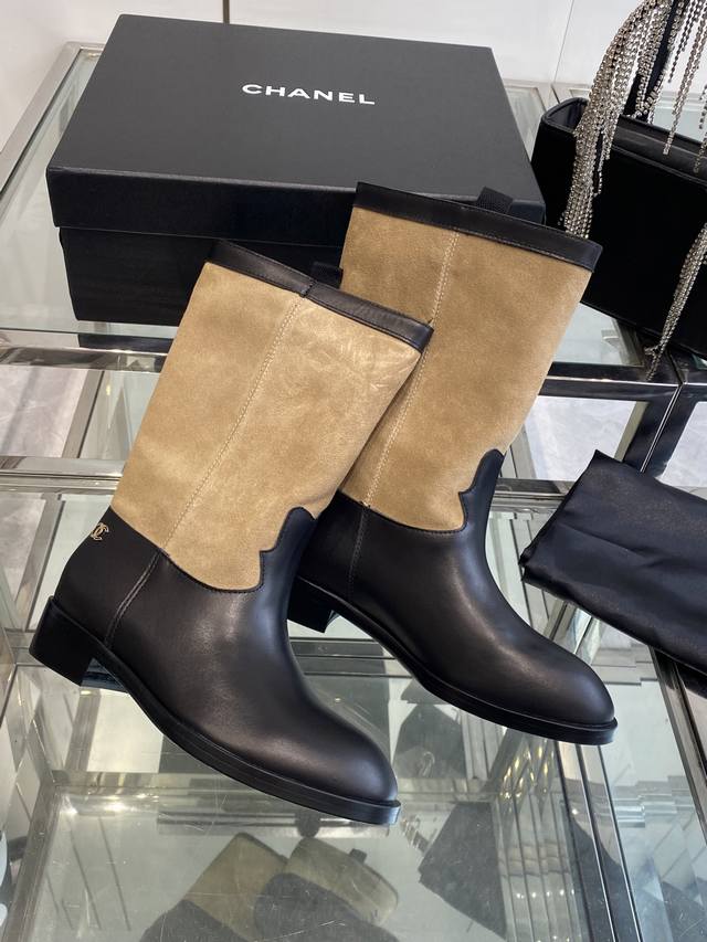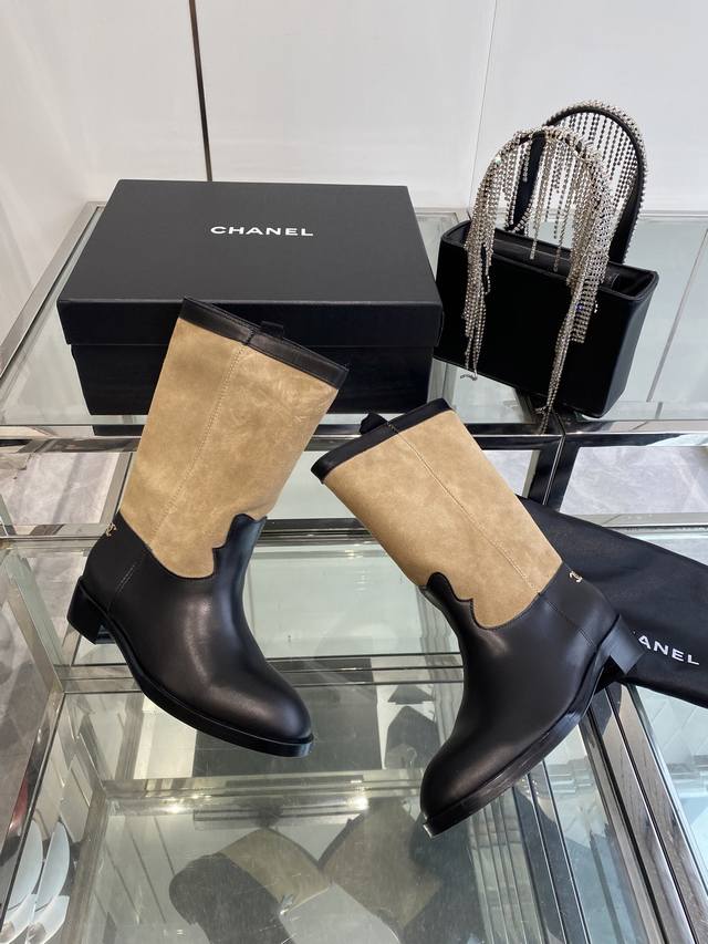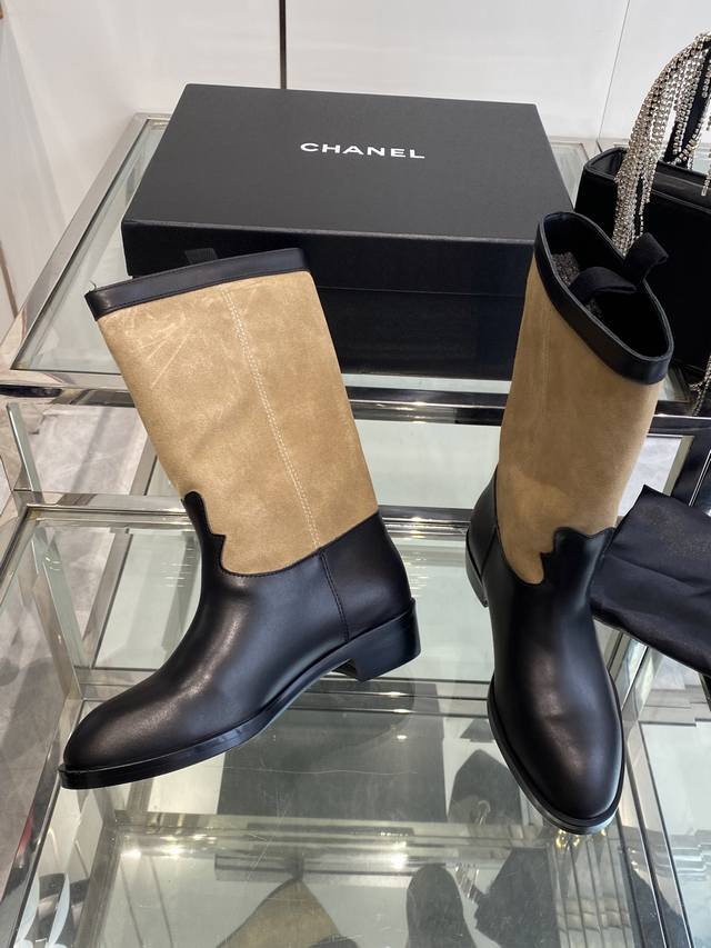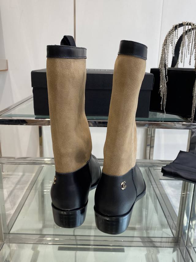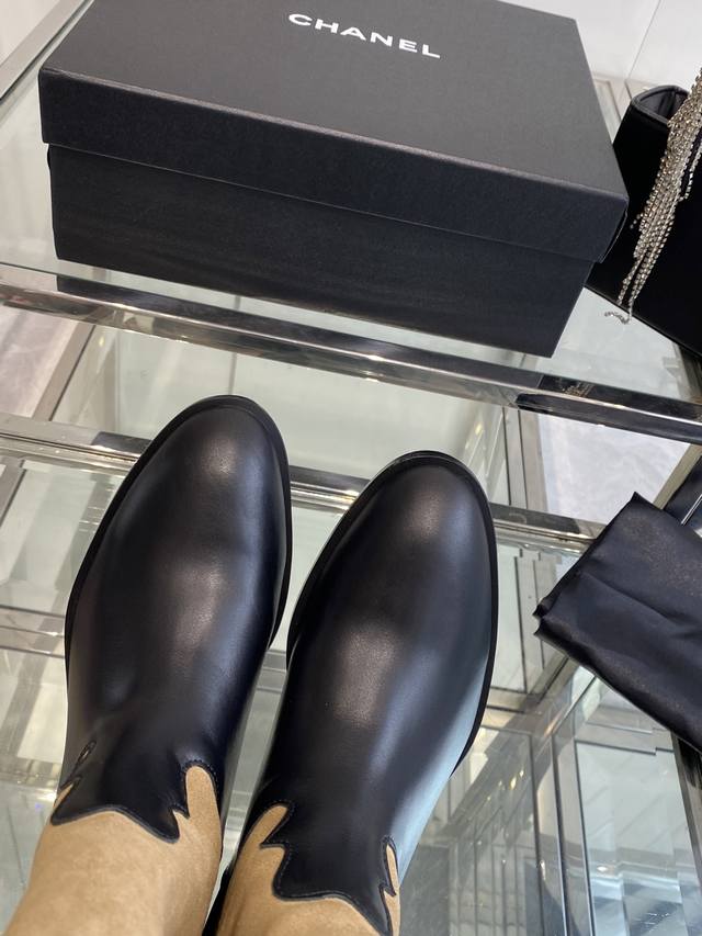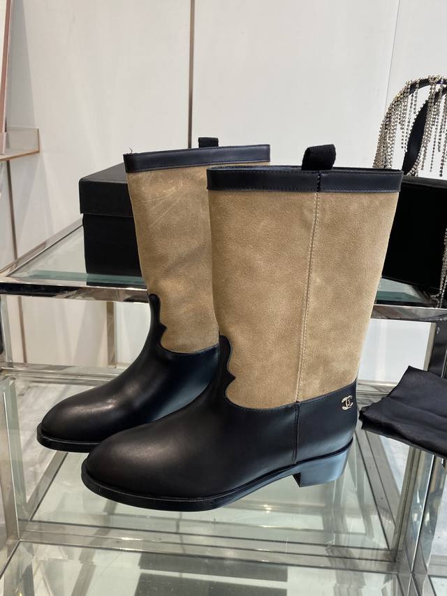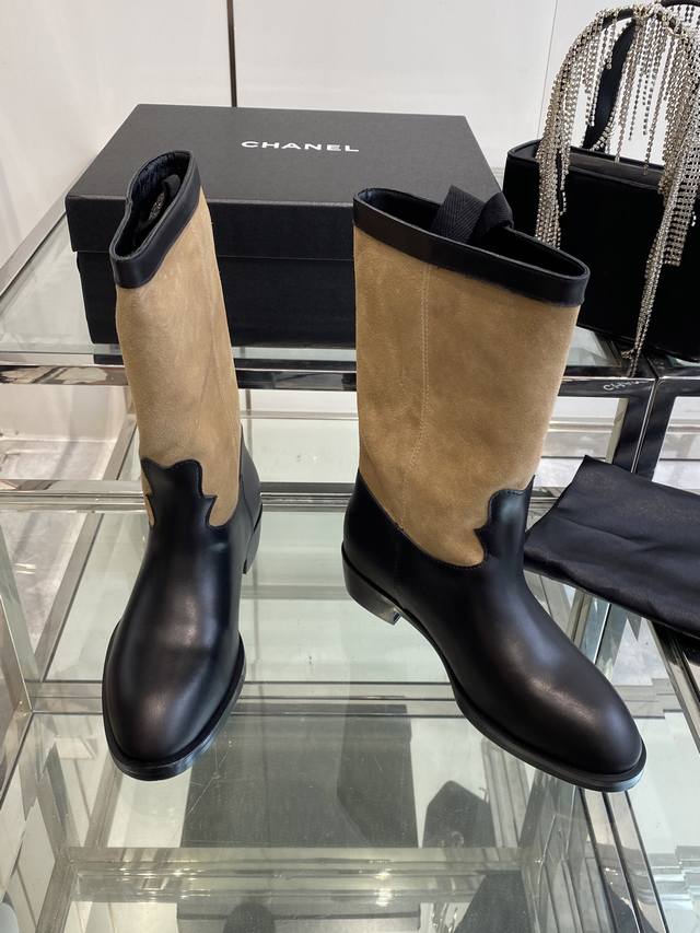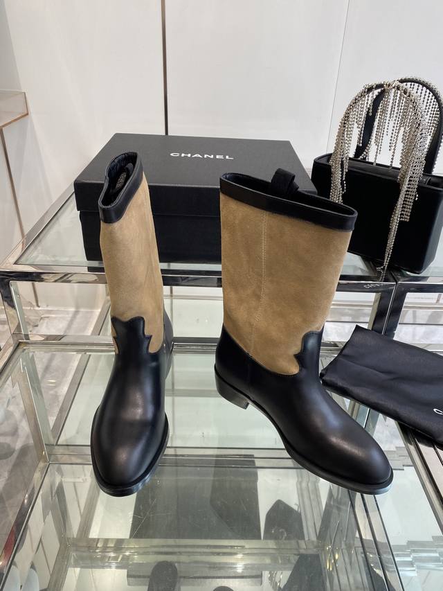 Chanel 香奈儿 25Ss秋冬新款 小香麂皮拼色一脚蹬骑士靴 复古风西部牛仔靴 独特的西部靴筒设计 流畅的曲线 不规则的边缘如同旷野中的自由线条 带着随性洒