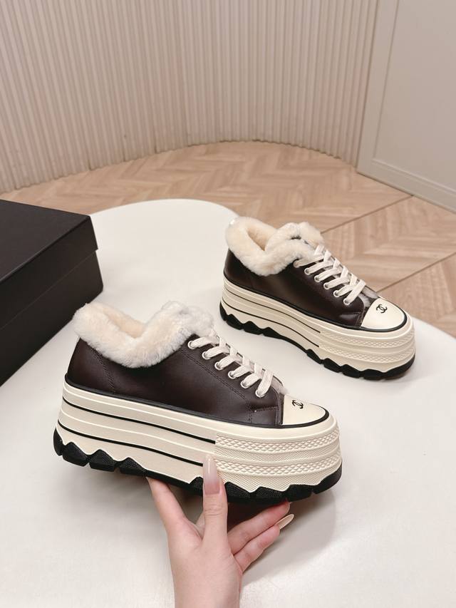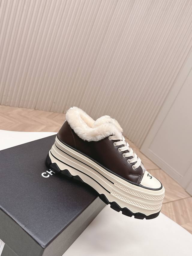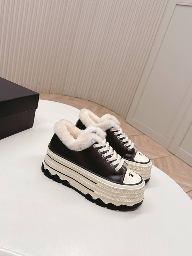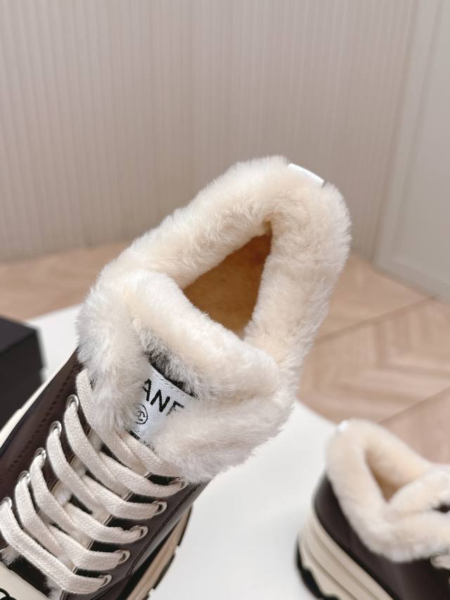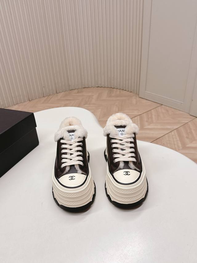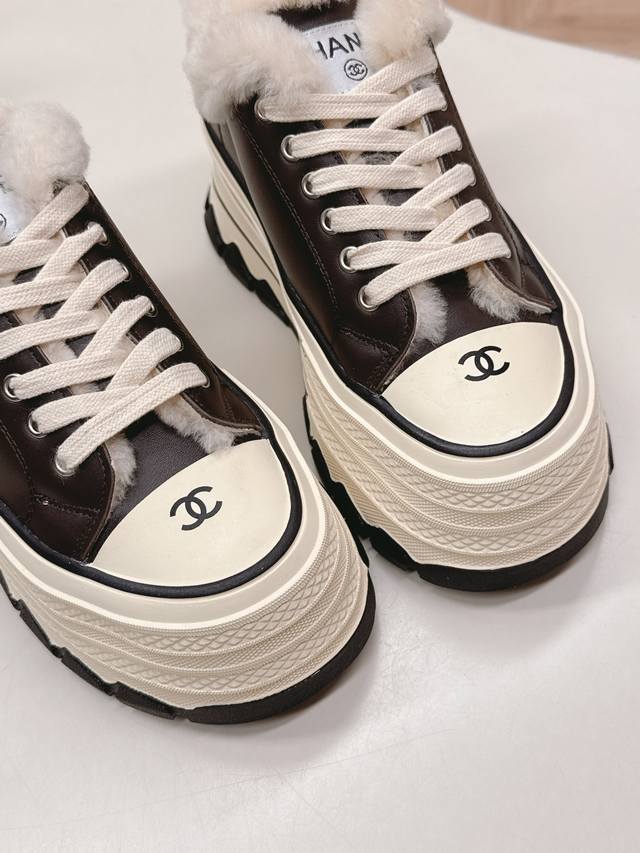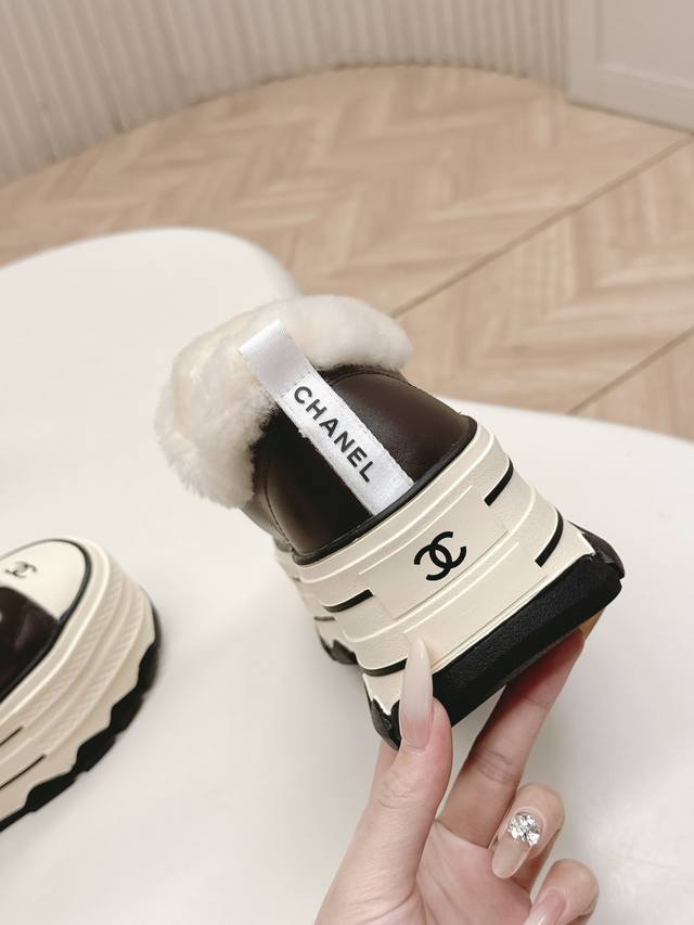 工厂p价p Chanel 香奈儿2025秋冬新款系带休闲小白鞋 小香字母Logo厚底圆头拼色运动滑板防寒羊羔毛女鞋...