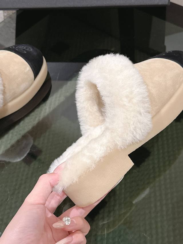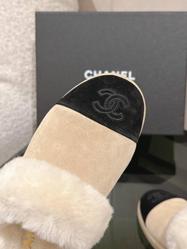 Chanel 25K 系列双C拼色毛毛雪地靴 米色麂皮+黑色拼接,经典双C标志超有辨识度。内里柔软羊毛,保暖又舒适,秋冬穿超合适!靴筒约3Cm,低筒设计,日常穿