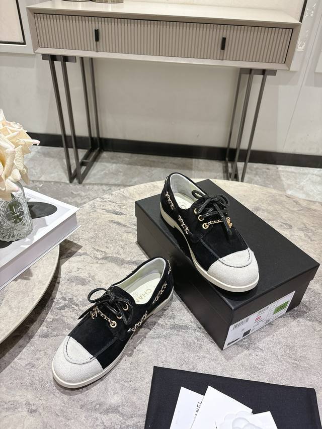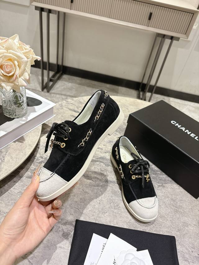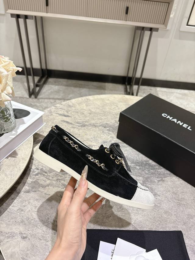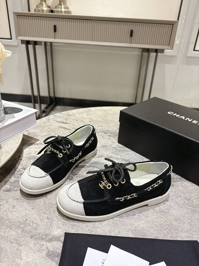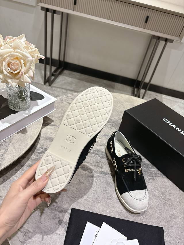 FFF DDD Chanel 26C早春最新款拼色麂皮 乐福鞋 DDD 超多明星时尚博主种草 鞋底超软 无比舒适的豆豆鞋 日行万步脚不疼 小香这双平底休闲鞋 可以说是这几年最具设计感的鞋子了 巧妙选用皮穿链条个性别致 一眼就爱上 麂皮拼色 日常又百搭 最最主要是选用了柔软的鞋底 超级舒服好穿 只要上脚试穿都会很惊喜 是难得将舒适 洋气 百搭融合得这么好的一款鞋 DDD 鞋面高丝光牛皮 DDD 混种羊皮里 DDD 原版开模耐磨生胶大底 DDD Size:35-39 40.41定制不退换 DDD