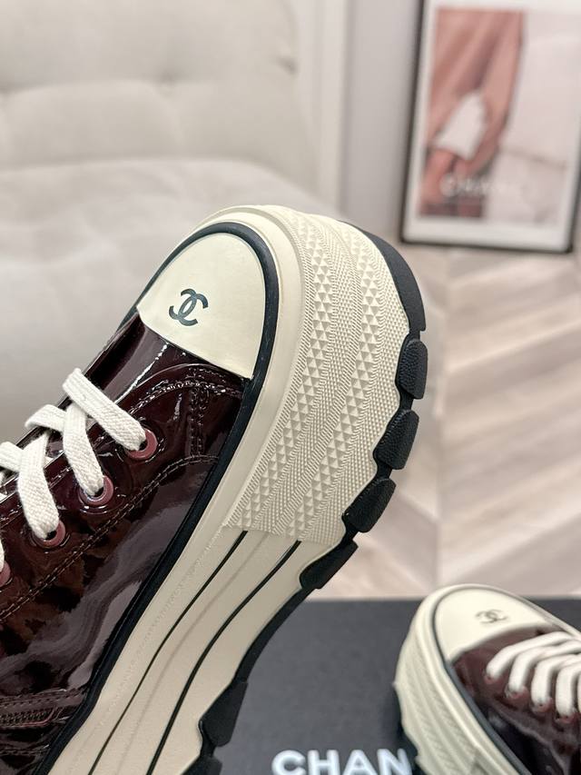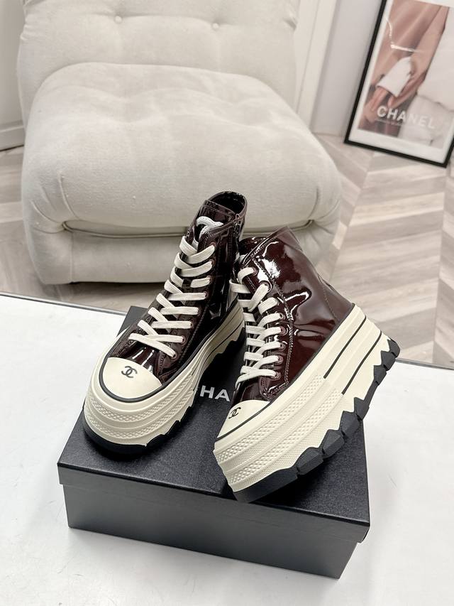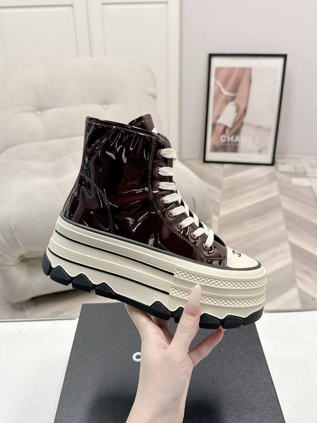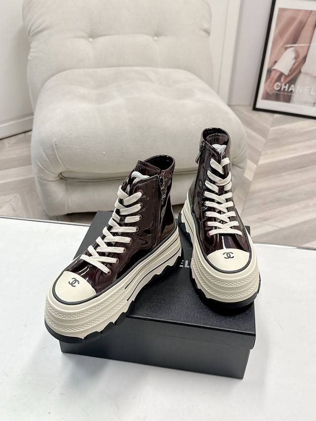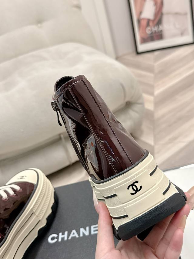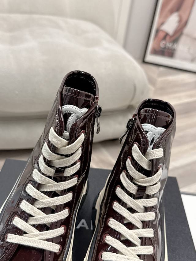 Size:35-40 40.41定做 DDD Chanel 香奶奶最新款26K休闲高帮靴靴 超多明星网红种草 原版模具定制 无敌漂亮又好穿 绝对仙女款 超级舒服,配色高级耐看 百搭 率性的休闲运动风,飒爽又自然,演绎香奈儿的时髦女性气质 鞋面 采用定制进口漆皮 内里混种羊皮 原版定制开模大底 DDD