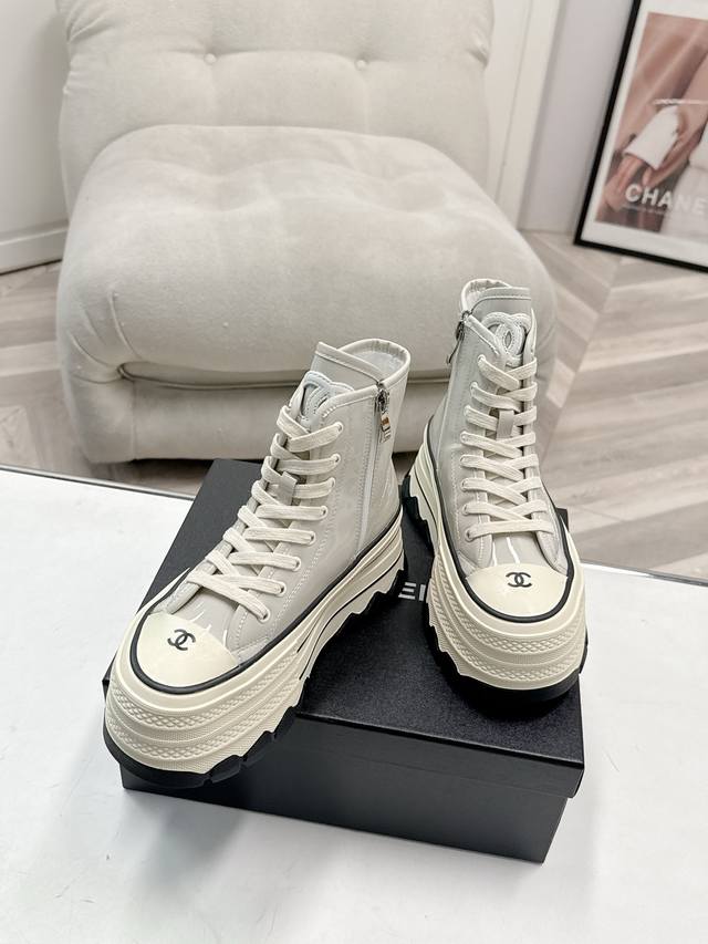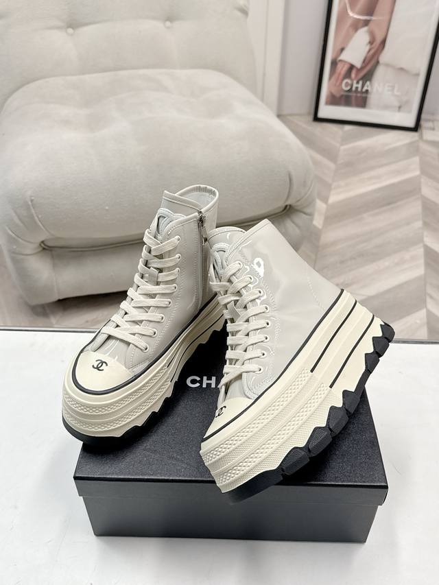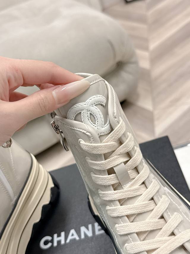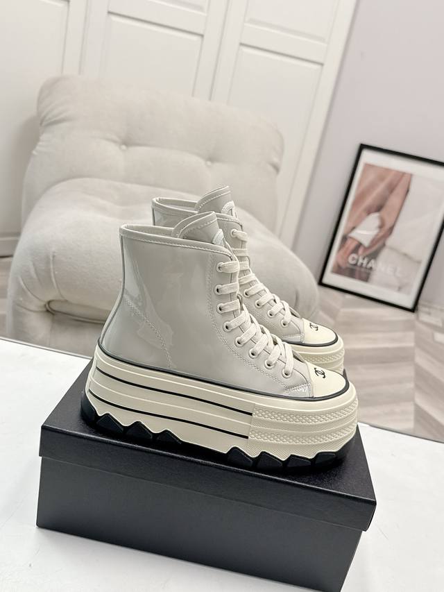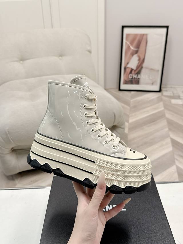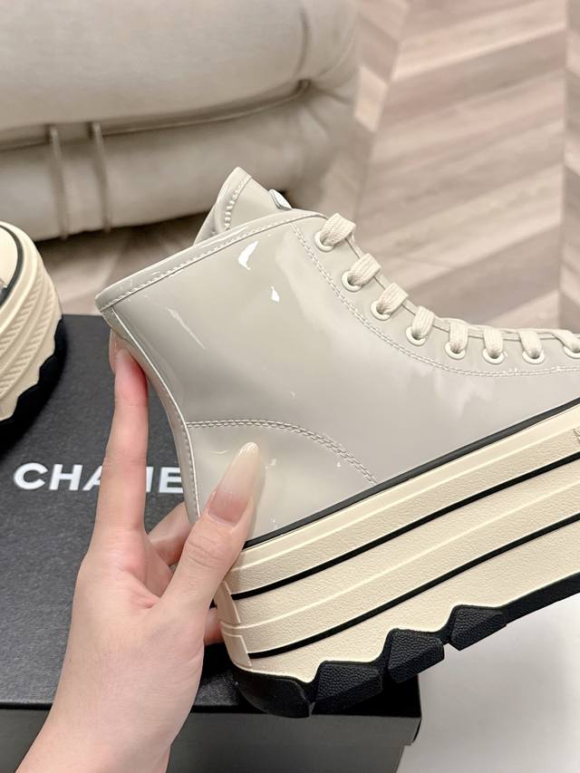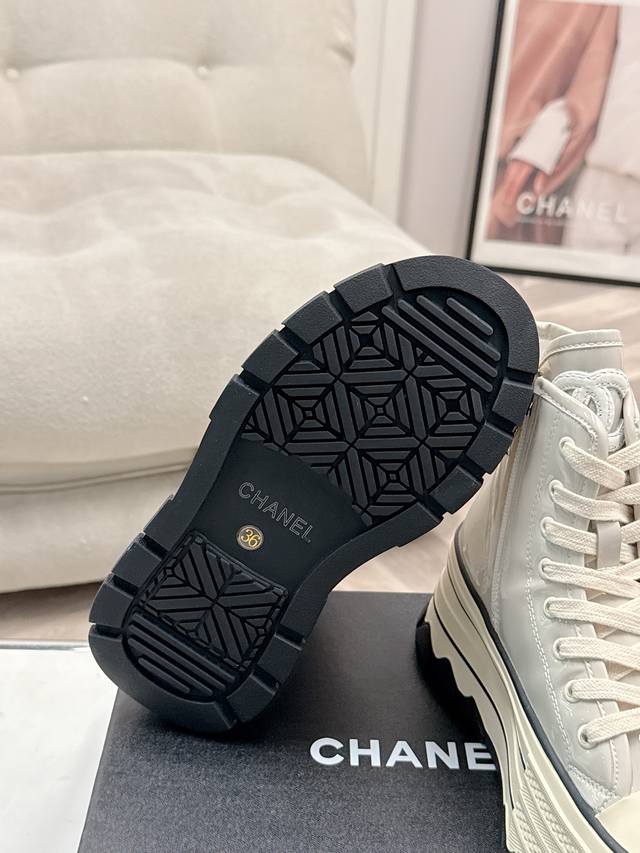 Size:35-40 40.41定做 DDD Chanel 香奶奶最新款26K休闲高帮靴靴 超多明星网红种草 原版模具定制 无敌漂亮又好穿 绝对仙女款 超级舒服,配色高级耐看 百搭 率性的休闲运动风,飒爽又自然,演绎香奈儿的时髦女性气质 鞋面 采用定制进口漆皮 内里混种羊皮 原版定制开模大底 DDD