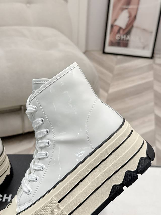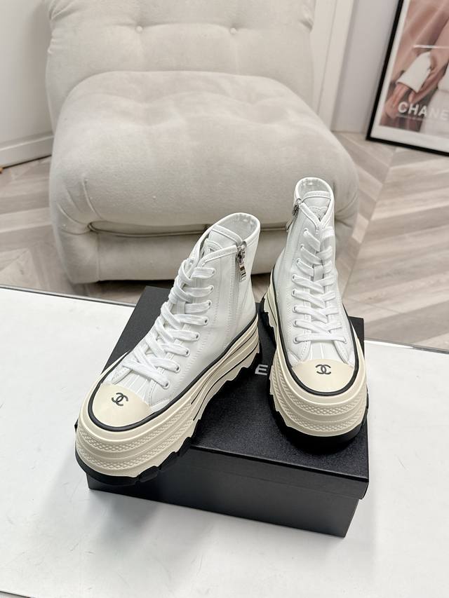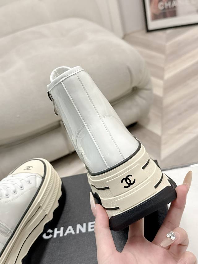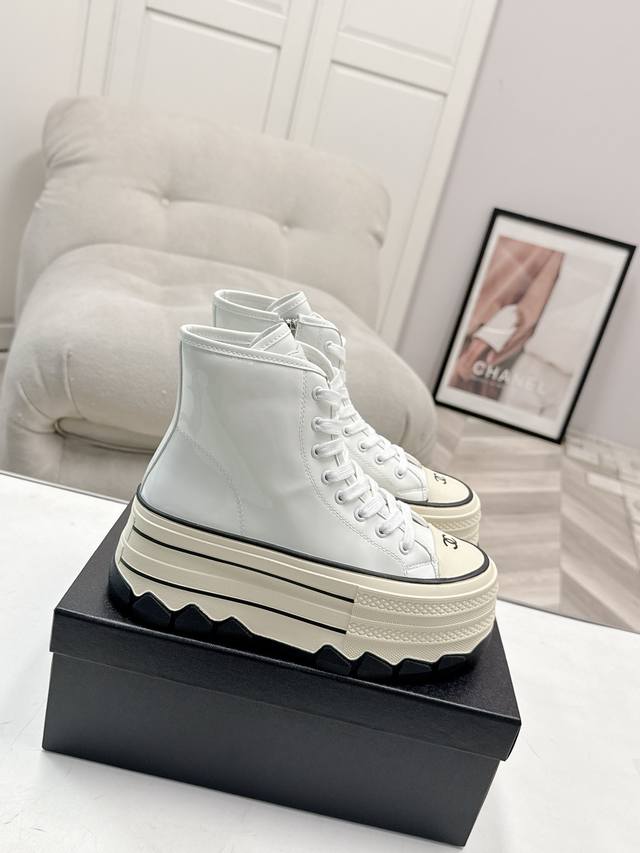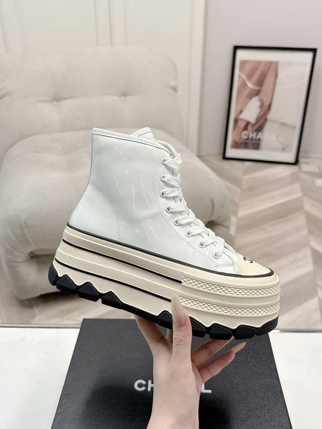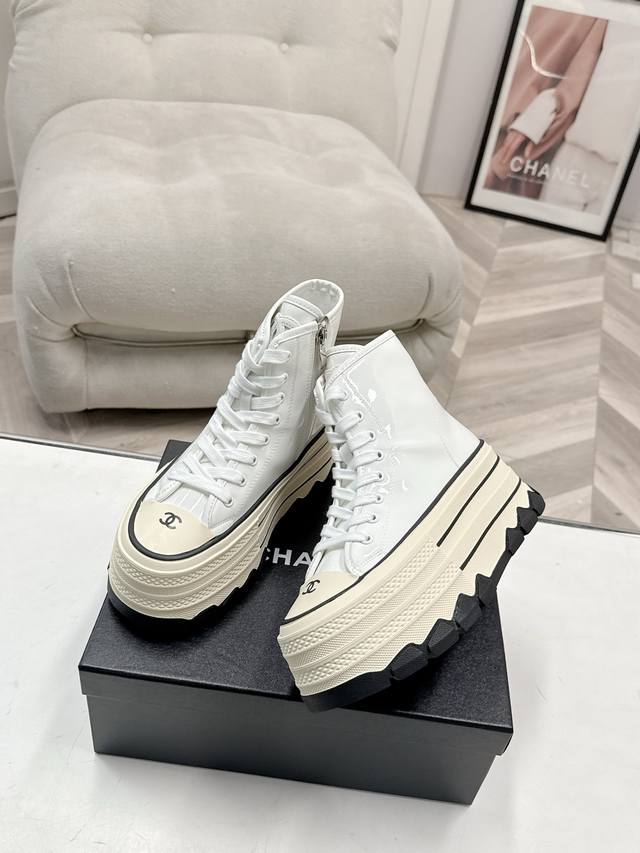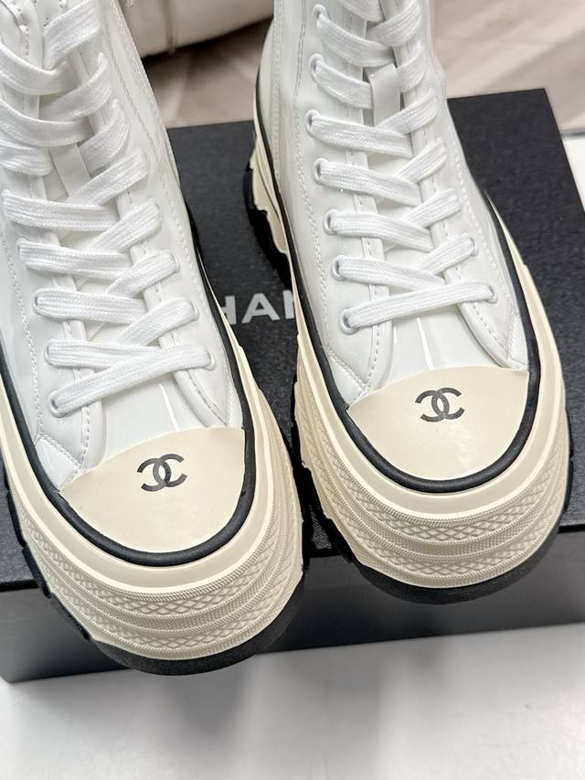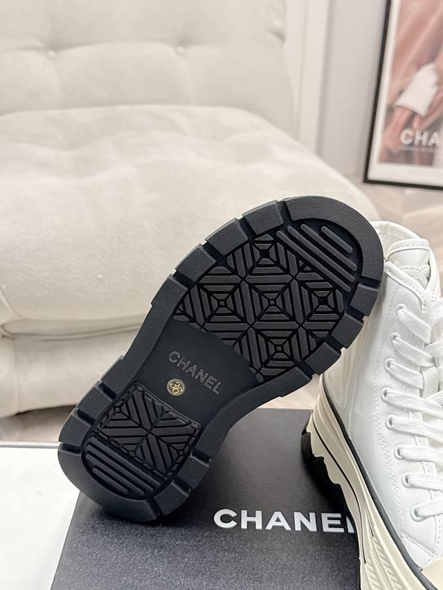 Size:35-40 40.41定做 DDD Chanel 香奶奶最新款26K休闲高帮靴靴 超多明星网红种草 原版模具定制 无敌漂亮又好穿 绝对仙女款 超级舒服,配色高级耐看 百搭 率性的休闲运动风,飒爽又自然,演绎香奈儿的时髦女性气质 鞋面 采用定制进口漆皮 内里混种羊皮 原版定制开模大底 DDD