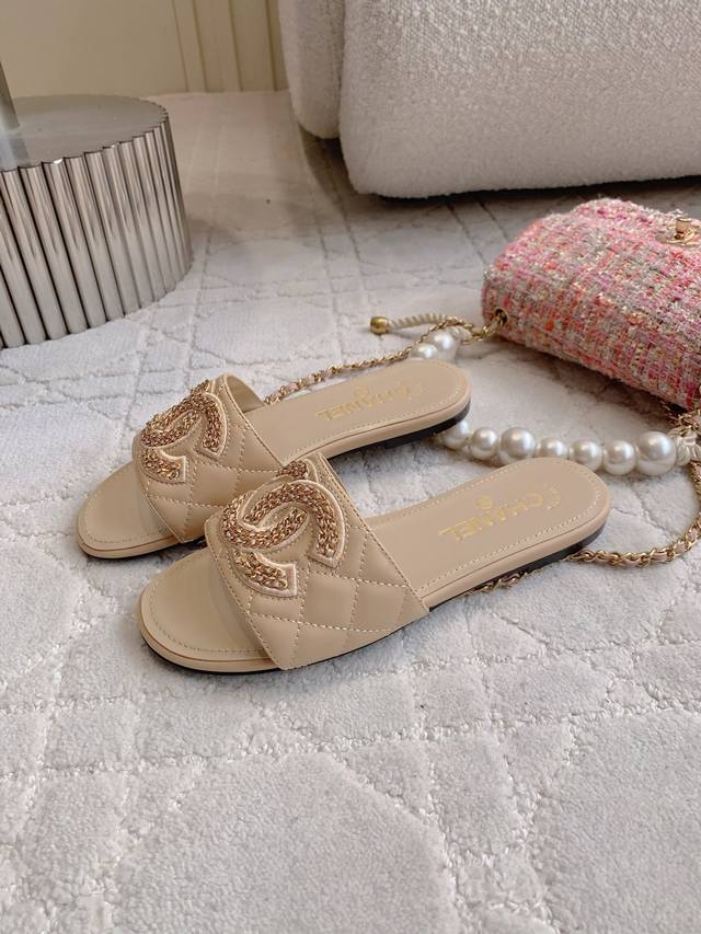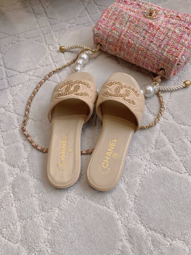 出厂价p DDD Chane*新款平底拖鞋 经典度假风 双C Logo装饰简约清爽 百搭单品 DDD 鞋面小牛皮 牛仔布 内里垫脚羊皮 意大利真皮大底 尺码35-39 34 40 41定做 DDD