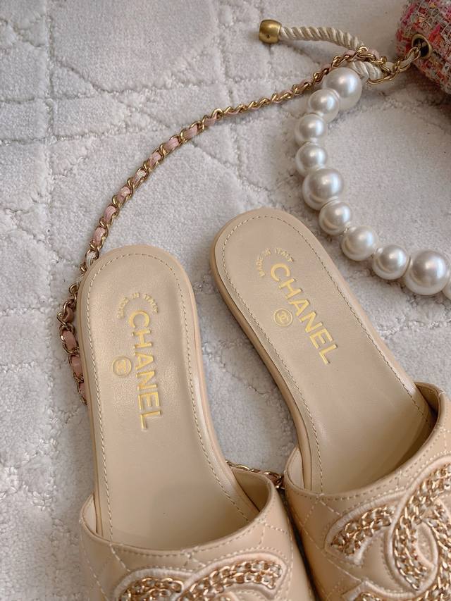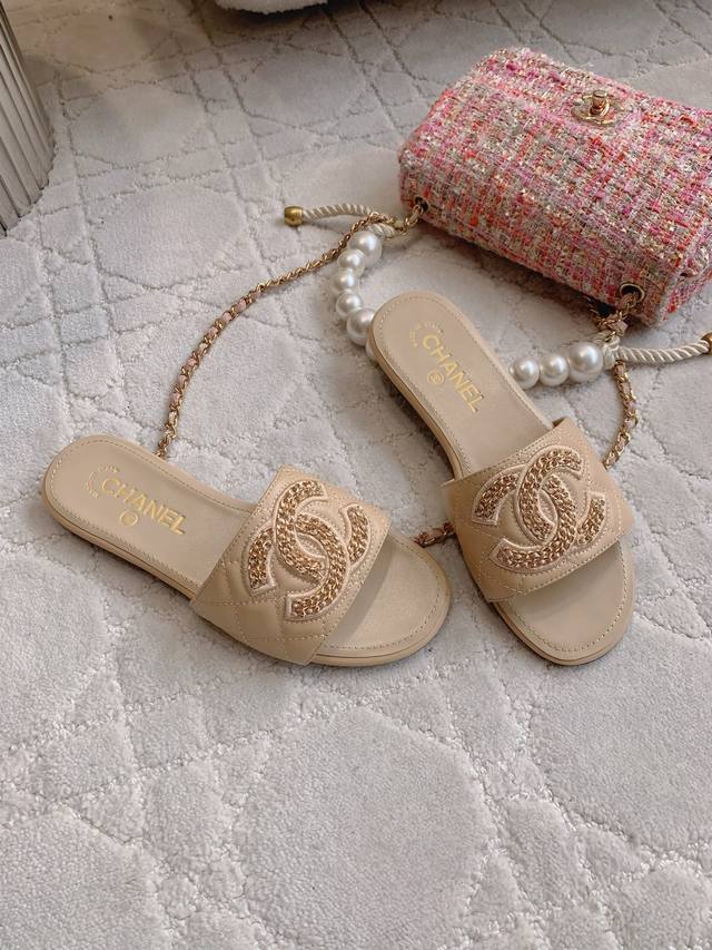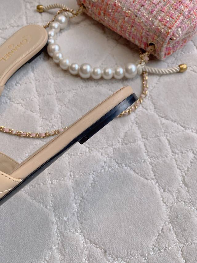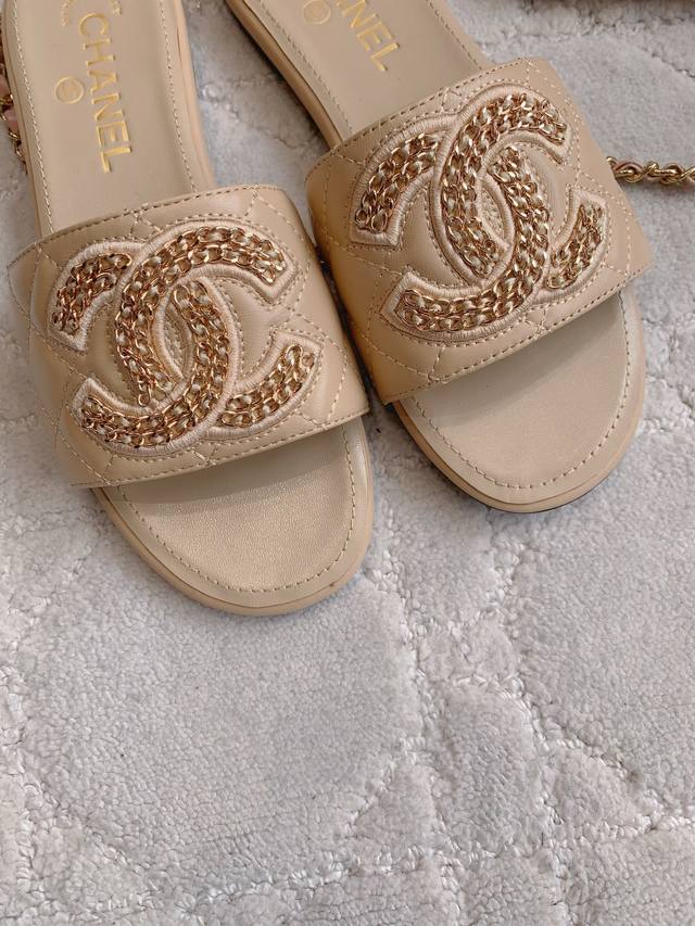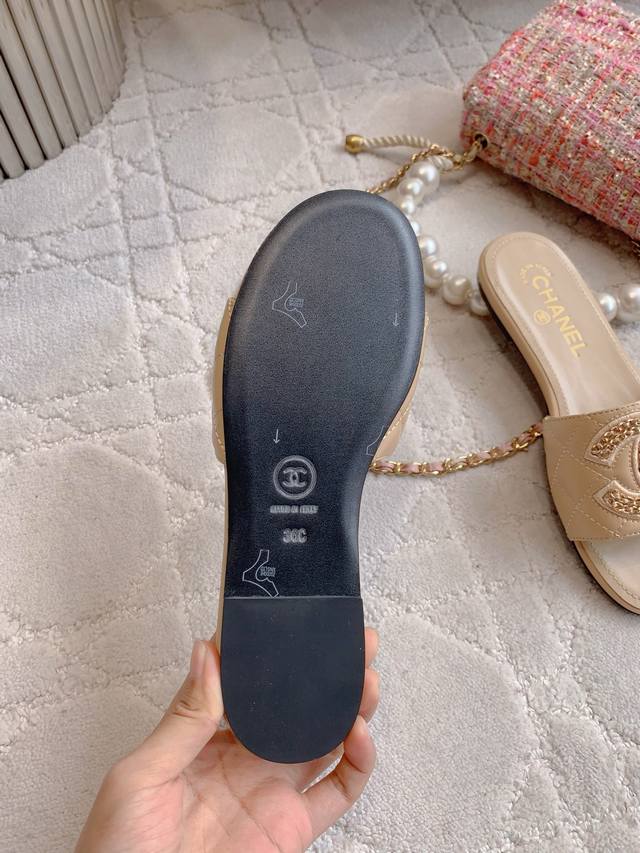 出厂价p Chane*新款平底拖鞋 经典度假风 双C Logo装饰简约清爽 百搭单品 鞋面小牛皮 牛仔布 内里垫脚羊皮 意大利真皮大底 尺码35-39 34 4