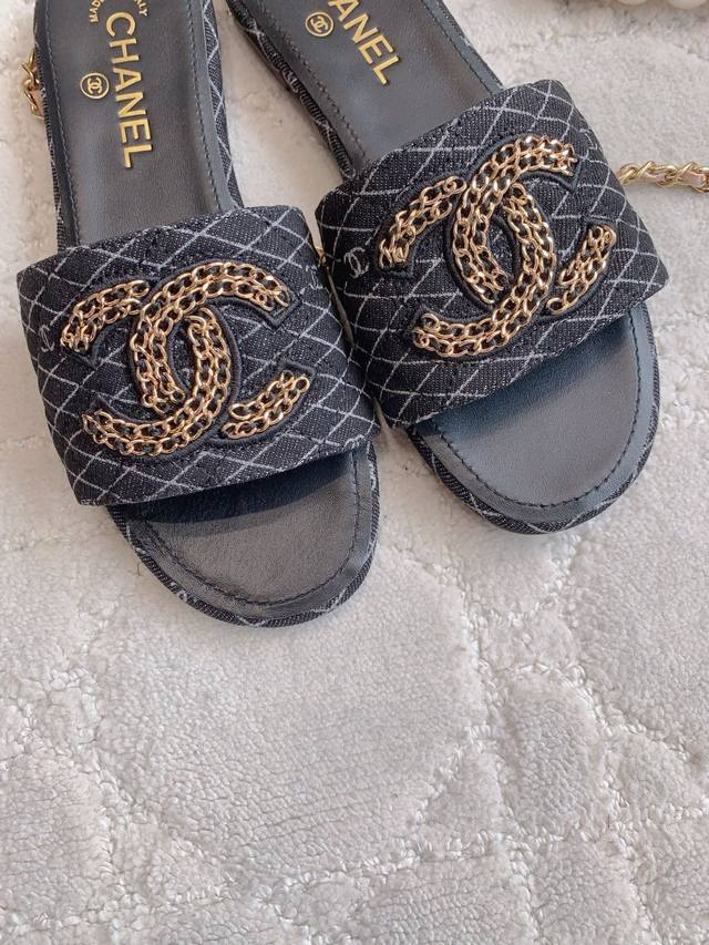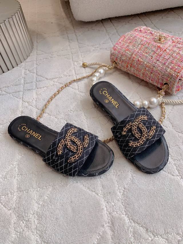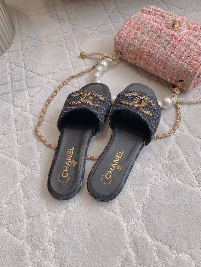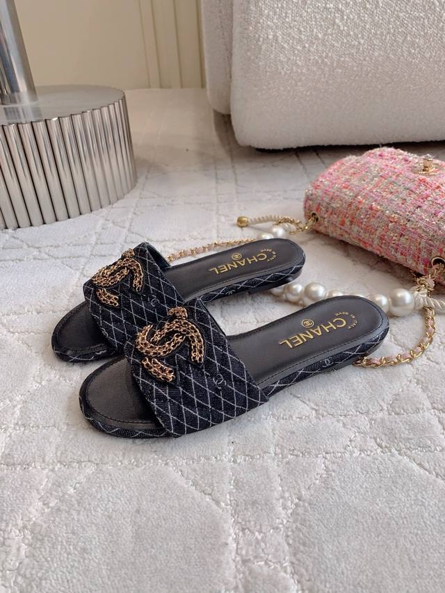 出厂价p DDD Chane*新款平底拖鞋 经典度假风 双C Logo装饰简约清爽 百搭单品 DDD 鞋面小牛皮 牛仔布 内里垫脚羊皮 意大利真皮大底 尺码35-39 34 40 41定做 DDD