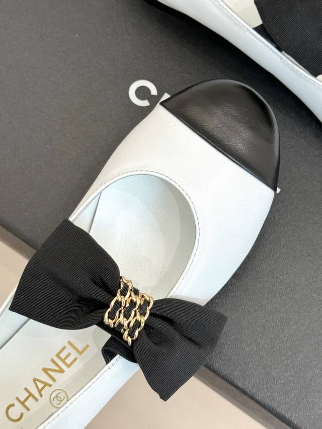 工厂P价 女装女鞋 运动原单 Chane*|小香25K新品链条蝴蝶结拼色 平底玛丽珍鞋 当小香的经典美学遇上时尚新风潮 这双鞋就成为时尚圈当之无愧的焦点。 它不仅仅是一双鞋 更是艺术与时尚的融合 每一处细节都彰显着品牌的独特魅力。 脚背处俏皮的蝴蝶结搭配闪耀的金属链条 蝴蝶结采用高品质罗缎材质 立体饱满 仿佛是少女心中的甜蜜梦想 为鞋子增添了一份灵动与俏皮 金属链条则以精湛工艺打造 细腻的光泽与流畅的线条 碰撞出甜酷交织的奇妙火花 让你在优雅与个性之间自由切换。 圆润的鞋头巧妙修饰脚面线条 为双足添上一抹