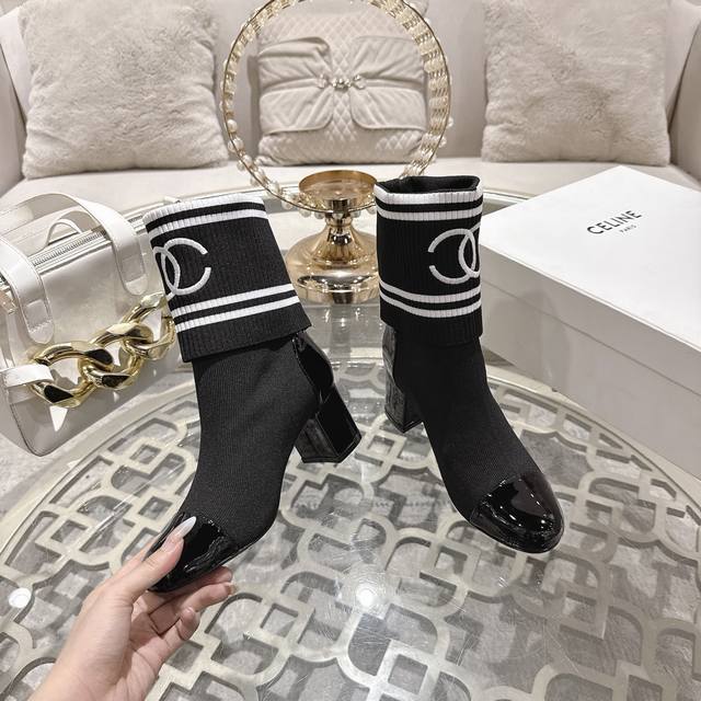 工厂p价 女装女鞋 运动原单 Chane*25Ss秋冬小香粗跟袜子靴 DDD 袜筒采用针织弹力毛线,上脚舒适显瘦!靴筒可下翻调节高度,搭配各种长短下装毫无违和感,可尽情实践关于美的各种搭配! DDD 鞋面:牛漆皮袜筒 DDD 内里:羊皮内里 DDD 跟高:5.5Cm DDD 鞋底:意大利真皮大底 DDD 码数:35-39 34,40,41定制不退换 DDD
