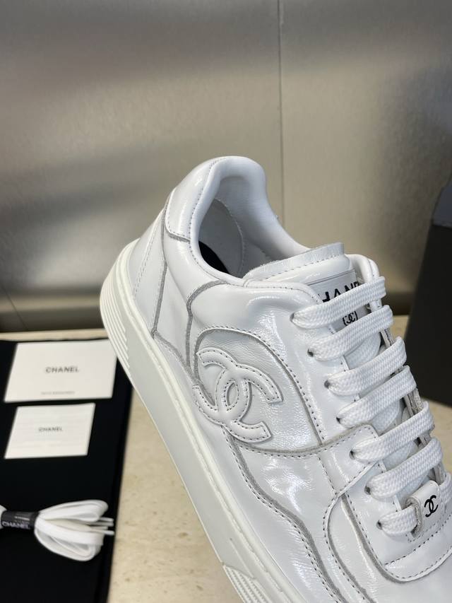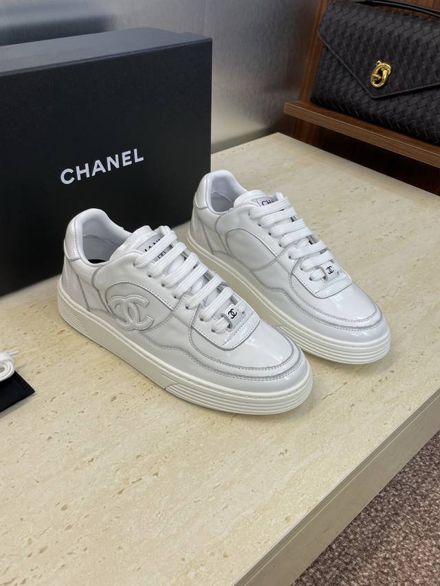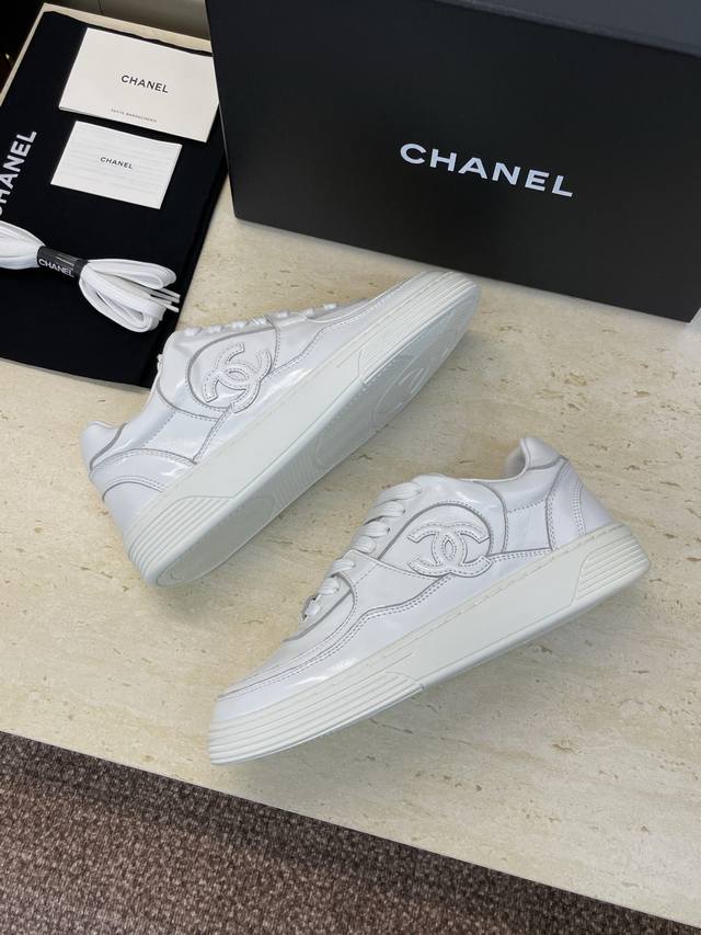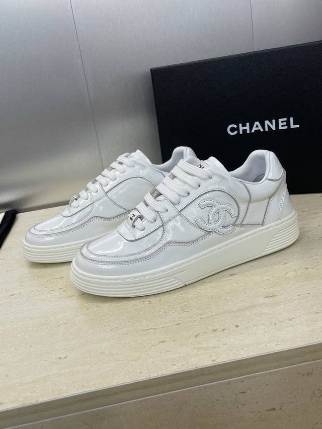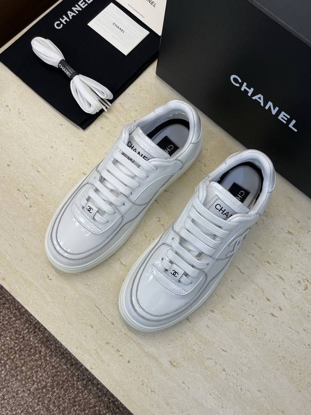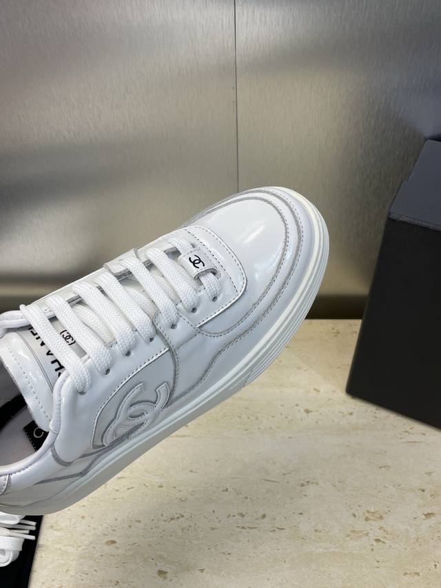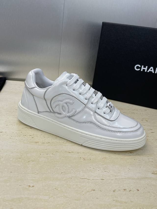 工厂P价P女码 男码280 Chanel 香奈儿2025秋冬新款情侣装系带休闲鞋 小香字母Logo厚底圆头拼色运动滑板鞋 材质:鞋面进口牛皱漆皮+水染羊皮内里+原版开模Tpu大底 Size:女码35-42 40.41.42定制不退换 男码38-45 38.45定制不退换