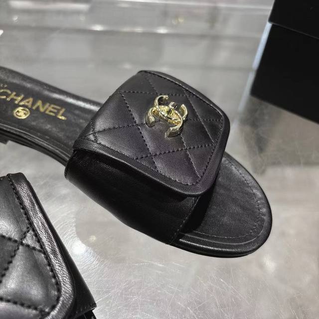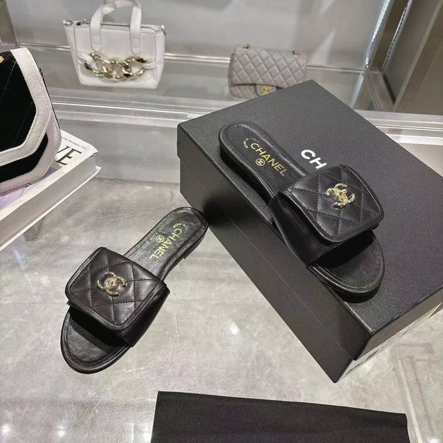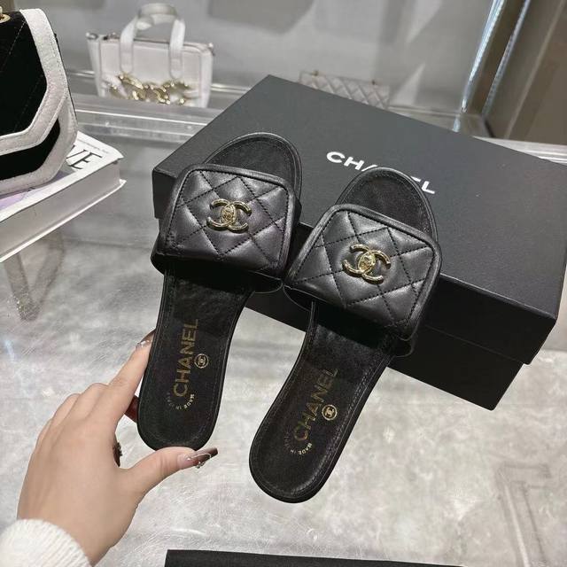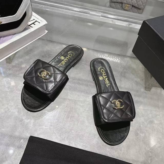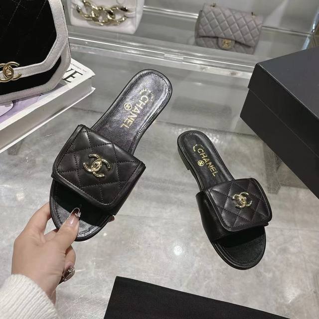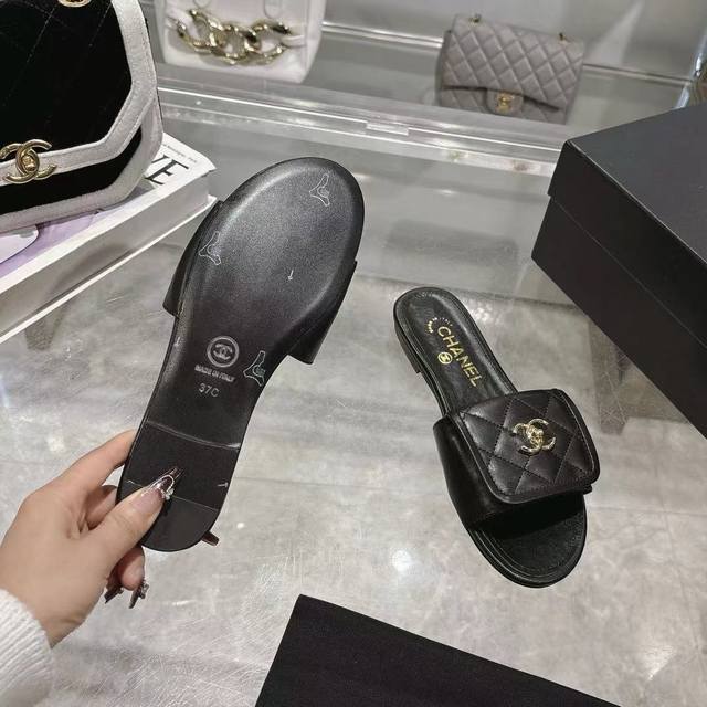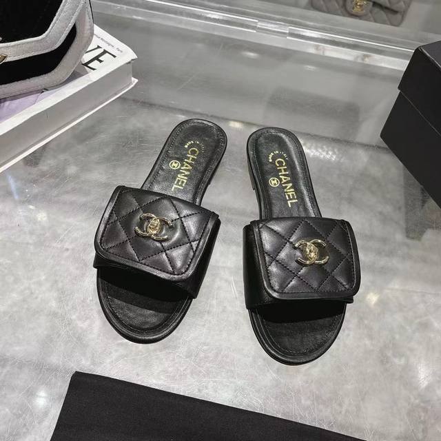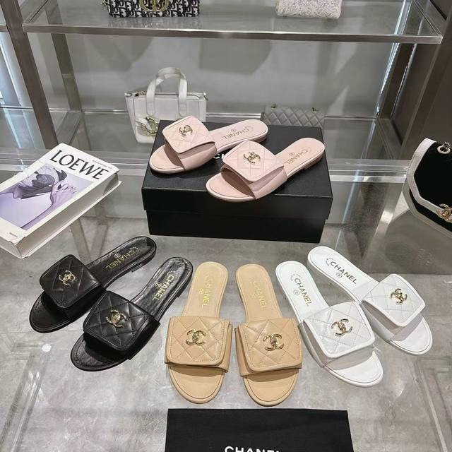 直销 香奈儿 25C新款女款 双C书包扣平底凉拖鞋,面料羊皮,颜色:黑色:白色:粉色:杏色,码数:5-40 定做41 42 43定做不退换