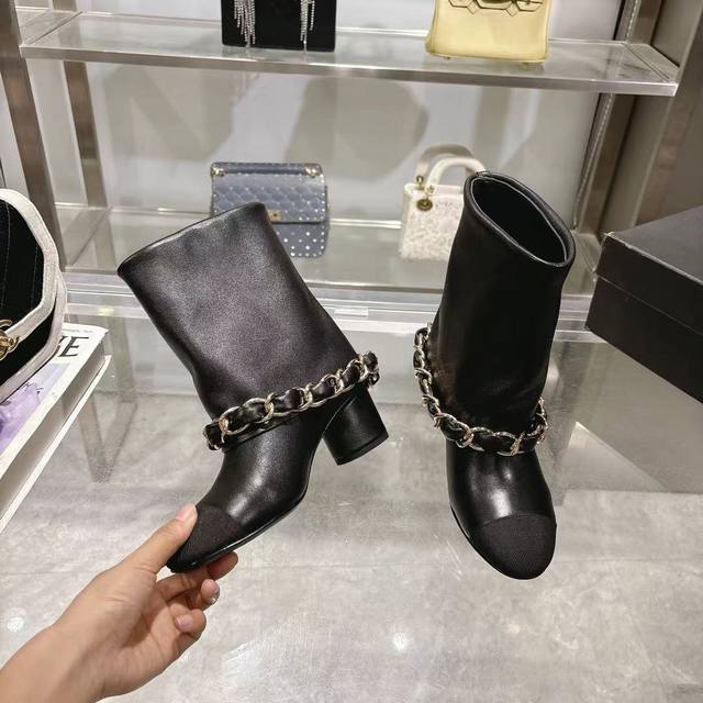 Chanel 小香25B秋冬走秀款翻口大链条 粗跟裤管靴 标志性的大链条设计,经典拼色,大Logo电绣 鞋面:进口羊皮 鞋底:意大利真皮大底 跟高:5.5Cm