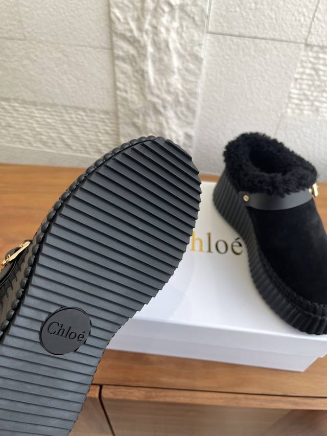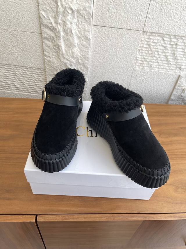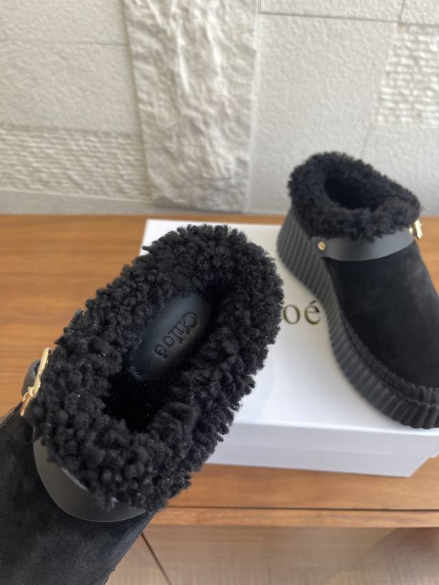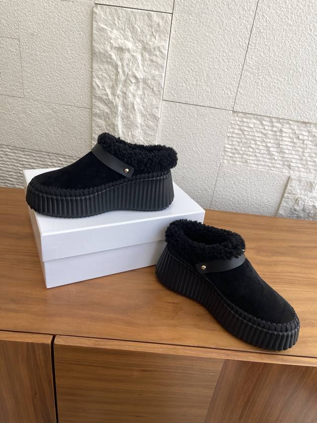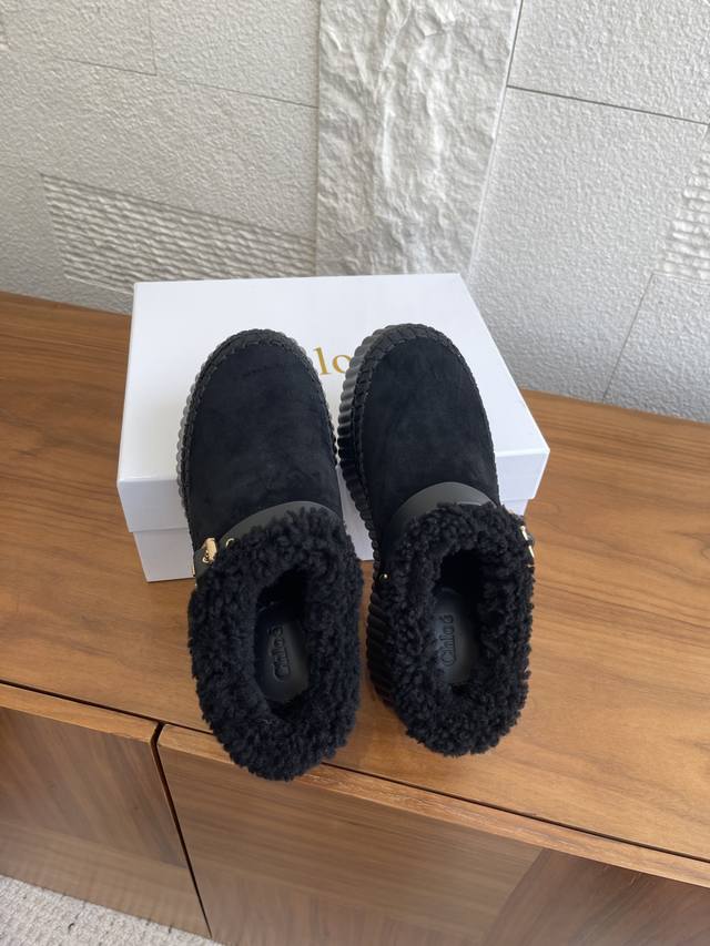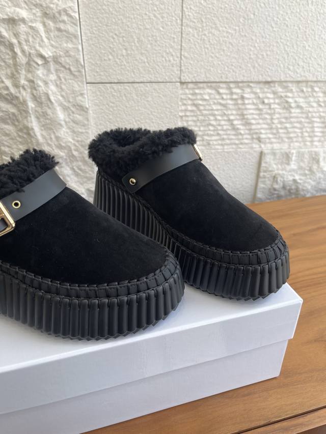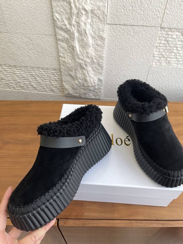 / 顶级版本: Chloe 蒄依 2025 秋冬新款 Nama坡跟穆勒鞋 一脚蹬 穆勒鞋 毛毛鞋 这款Nama坡跟穆勒鞋由绒面小牛皮和羊羔皮制成,并在皮革饰带上点缀