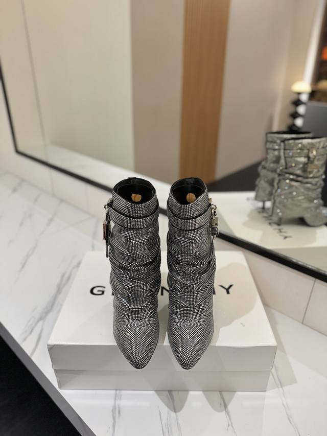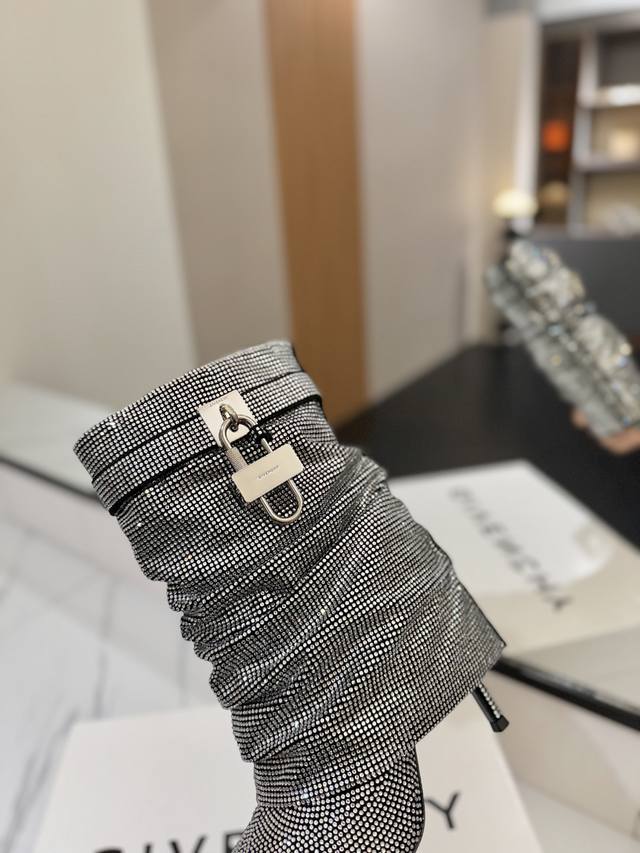 专柜正品级定制版本 DDD Givenchy纪梵希 Shark Lock 系列 挂锁 满钻四万多颗短靴打皱新款,市面最高版本 DDD 纪梵希 锁扣 风靡整个时尚圈秒变大长腿 DDD 原版开发鞋型超级正 最高还原度鞋型 DDD 包裹性非常好 显瘦 显高级 超级舒适 DDD 鞋面:进口超迁绒 耐寒耐折耐刮不掉钻 DDD 内里:小牛皮 DDD 定制对版私模标志性Logo锁扣 DDD 锁扣搭配有纯银色,纯金色,金银混搭,下单备注即可 DDD 鞋跟:对版私模 跟高10.5Cm DDD 大底 :进口真皮大底 DDD