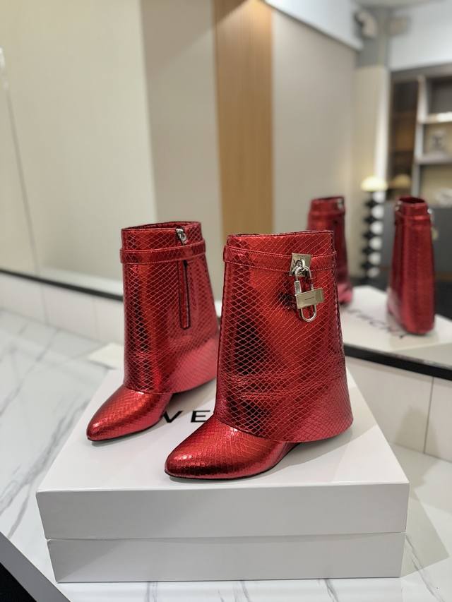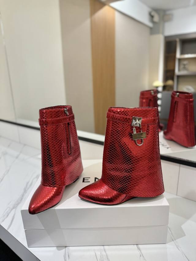 专柜正品级定制版本 DDD Givenchy纪梵希 Shark Lock 系列 挂锁 短靴 新款,市面最高版本 DDD 纪梵希 锁扣 风靡整个时尚圈 DDD 原版开发鞋型超级正 最高还原度鞋型 DDD 包裹性非常好 显瘦 显高级 超级舒适 DDD 鞋面:蛇纹环保皮 DDD 内里:小牛皮 DDD 定制对版私模标志性Logo锁扣 DDD 锁扣搭配有纯银色,纯金色,金银混搭,下单备注即可 DDD 鞋跟:对版私模 跟高8.5Cm DDD 大底 :进口真皮大底 DDD 码数:35-40 34.40 41:42 可定