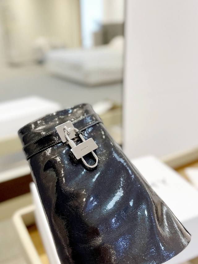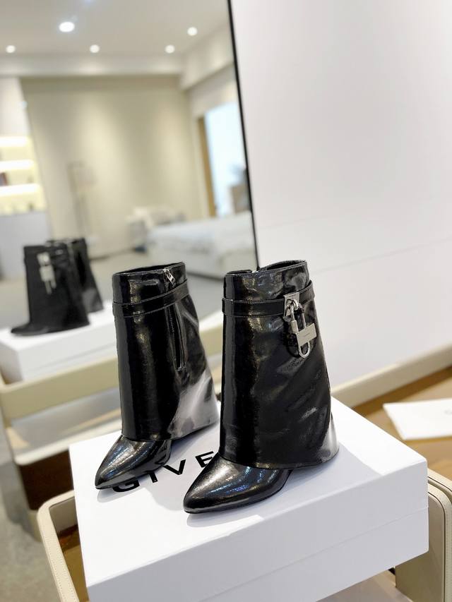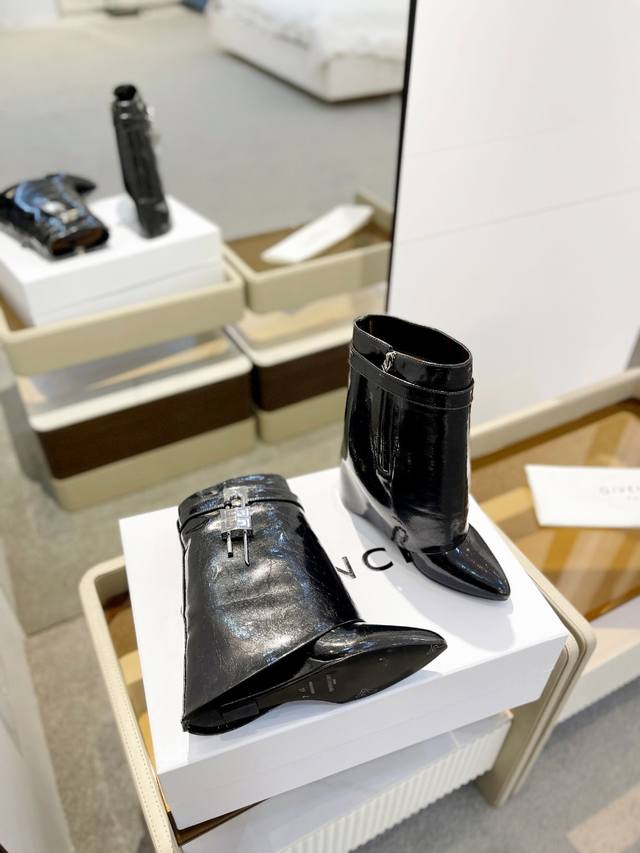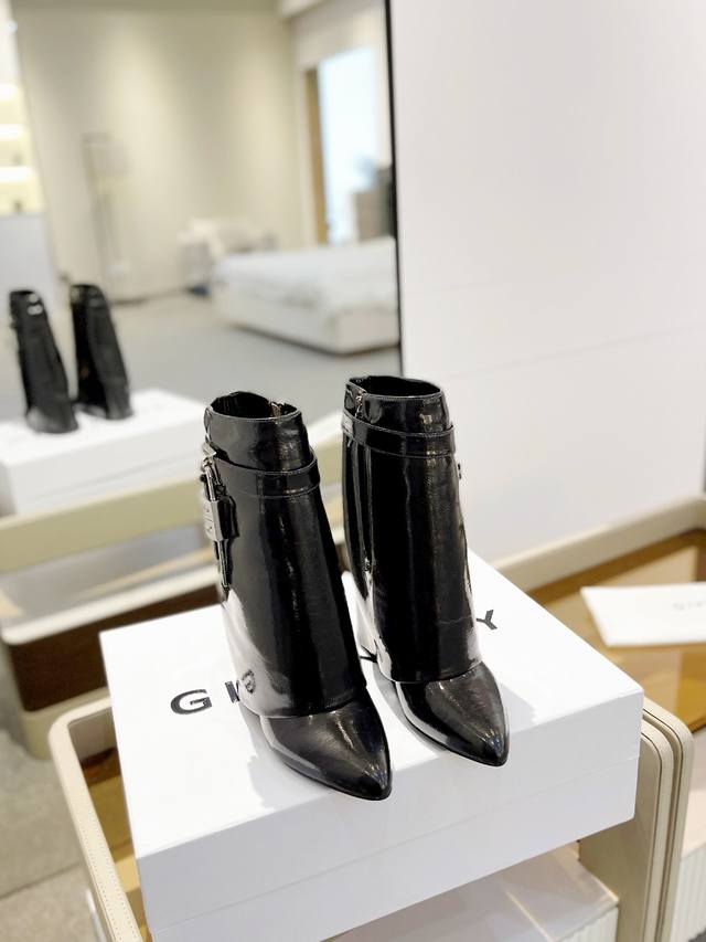价格p: 专柜正品级定制版本 Givenchy0 新款高跟层压皮皱短靴,市面最高版本 纪梵希 锁扣 皱漆款 风靡整个时尚圈 原版开发鞋型超级正 最高还原度鞋型