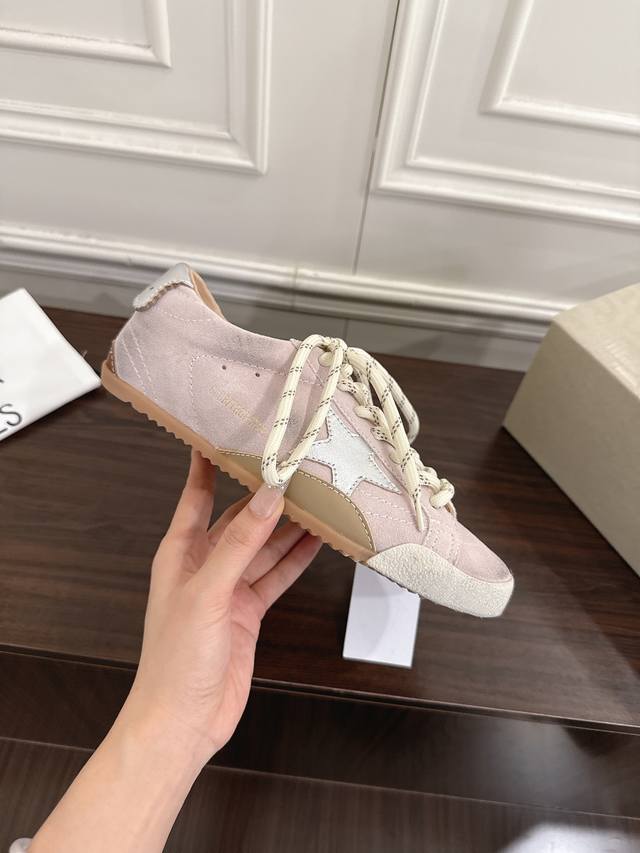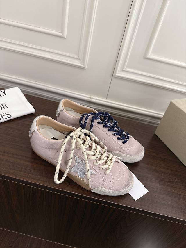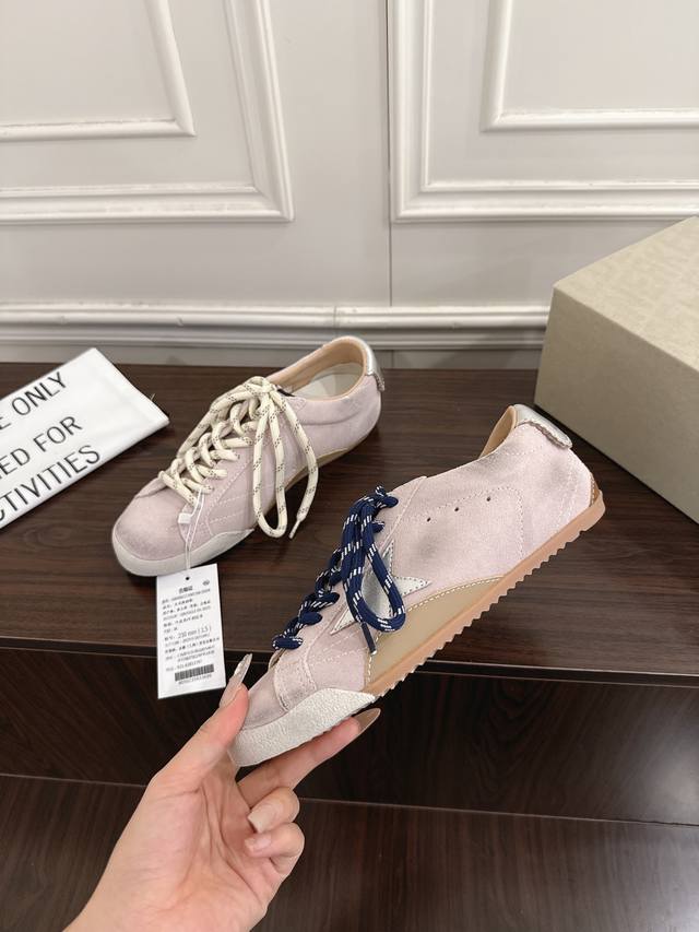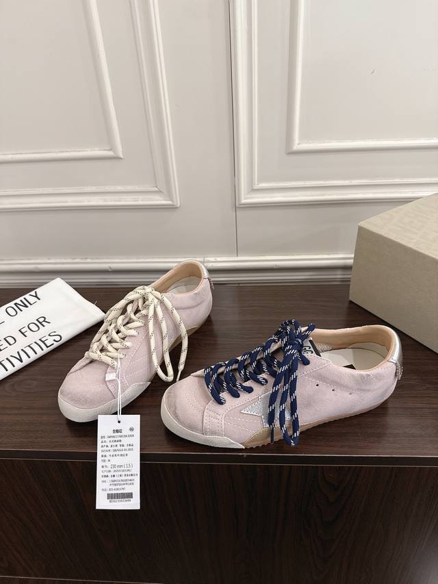 FFF 情侣款 DDD Ggdb Golden Goos* 25Ss做旧星星休闲板鞋 DDD 采用复古做旧工艺,麂皮材质呈现出自然的磨损质感,鞋身侧面的星形装饰增添辨识度,搭配黑白两色的鞋带,并且还附赠备用鞋带,细节设计兼具个性与实用性。 DDD 麂皮面料柔软且富有质感,做旧处理模拟出经年穿着的复古氛围,鞋型贴合脚型,兼具舒适感与潮流感。搭配浅色系牛仔裤,上衣选择白色基础T恤或Oversize卫衣,外搭牛仔夹克或卡其色工装外套,轻松打造随性复古的日常造型。 DDD 鞋面:牛反绒 DDD 内里:牛皮 DDD