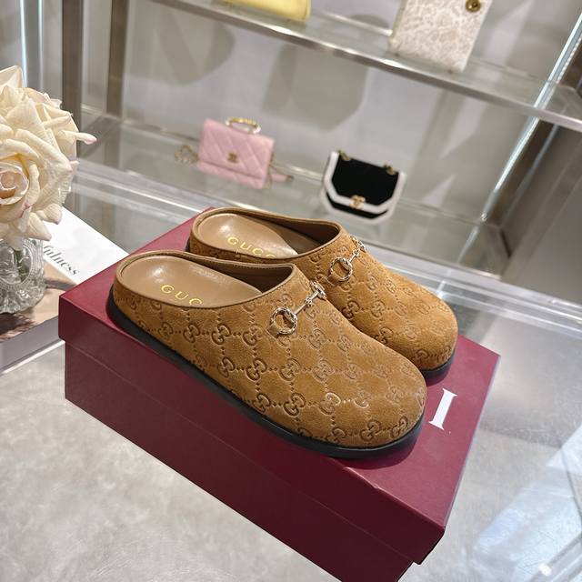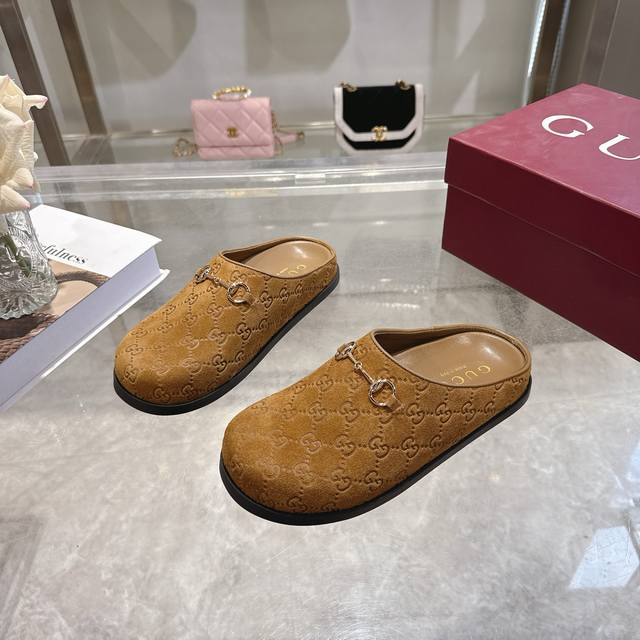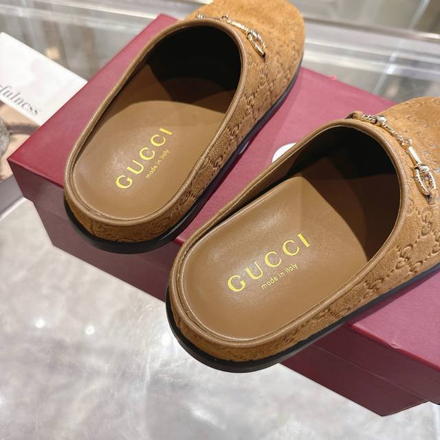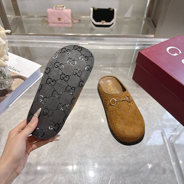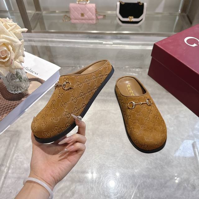 / 新款牛皮反绒马衔扣女士裸脚拖鞋 Gg在 2025 早秋系列中继续使用档案符号。Horsebit 硬件让人想起品牌的马术传统,出现在这双 Camel 和反绒牛皮高