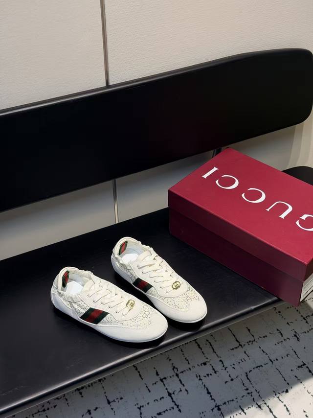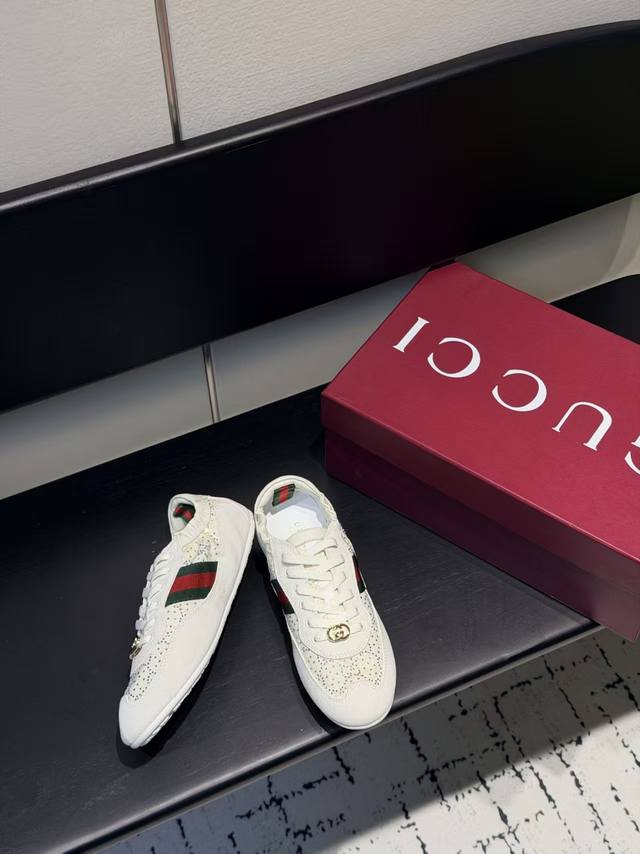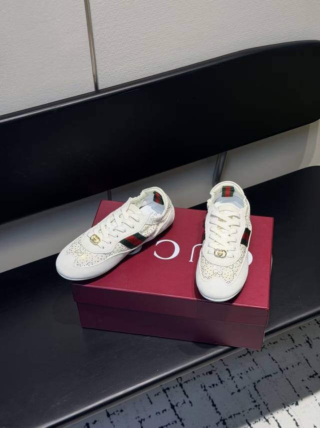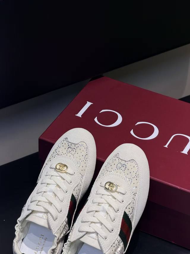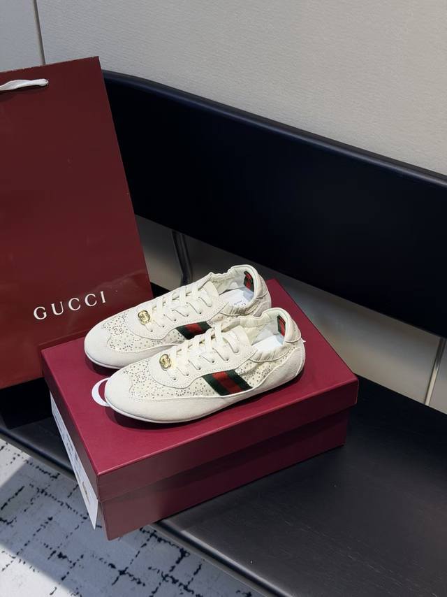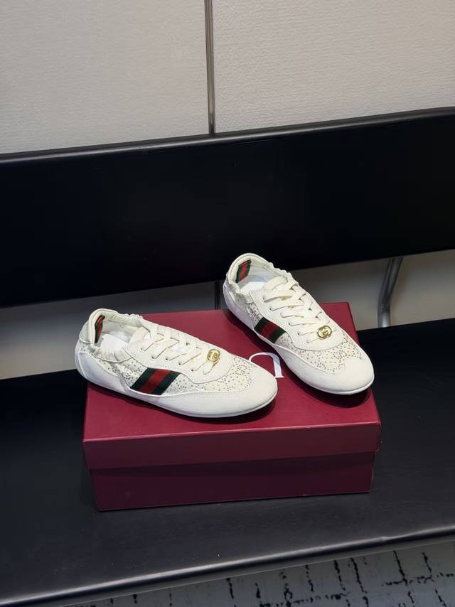 / 顶级代购 DDD Gg水晶钻鞋超级轻盈柔软到可以卷起来的一双跳舞鞋。棕色牛反绒面+Gg布,精心缀饰Gg水晶钻。轻盈质感与闪耀外观兼具。鞋口羊皮包缝橡筋工艺。张驰