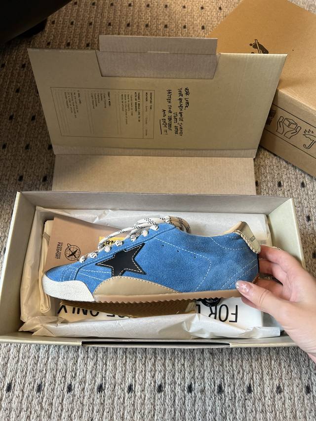 顶级品质 DDD Ggdb Golden Goos* 25Ss做旧星星休闲板鞋 DDD 采用复古做旧工艺,蓝色麂皮材质呈现出自然的磨损质感,鞋身侧面的星形装饰增添辨识度,搭配黑白两色的鞋带,并且还附赠备用鞋带,细节设计兼具个性与实用性。 DDD 麂皮面料柔软且富有质感,做旧处理模拟出经年穿着的复古氛围,鞋型贴合脚型,兼具舒适感与潮流感。搭配浅色系牛仔裤,上衣选择白色基础T恤或Oversize卫衣,外搭牛仔夹克或卡其色工装外套,轻松打造随性复古的日常造型。 DDD 鞋面:牛反绒 DDD 内里:牛皮 DDD