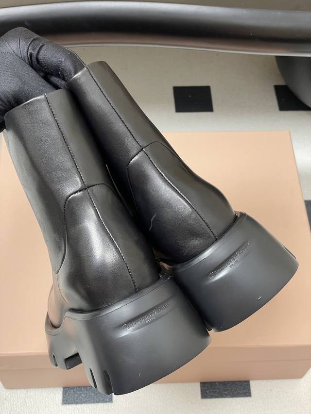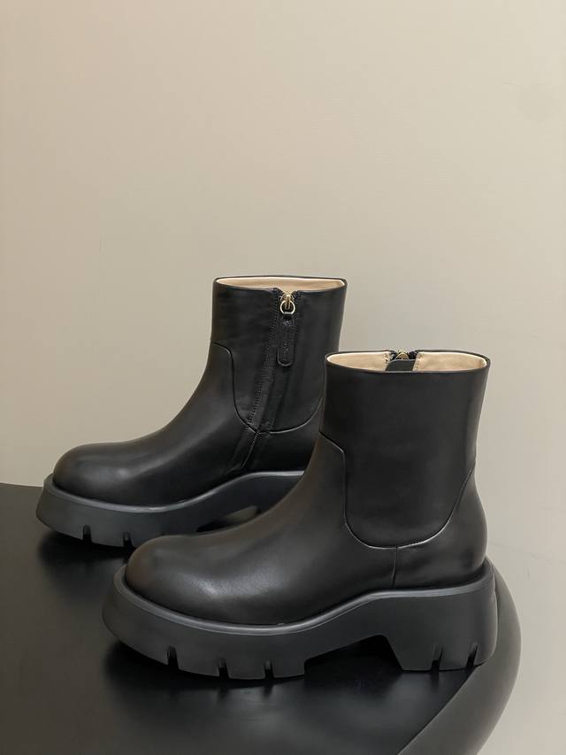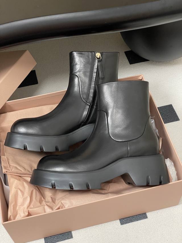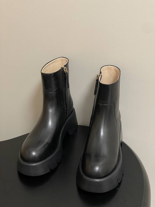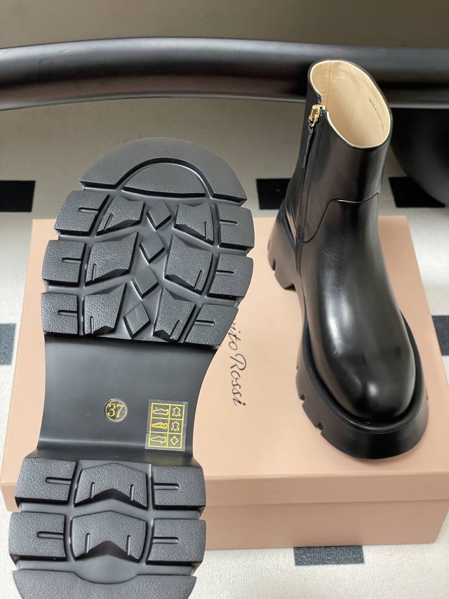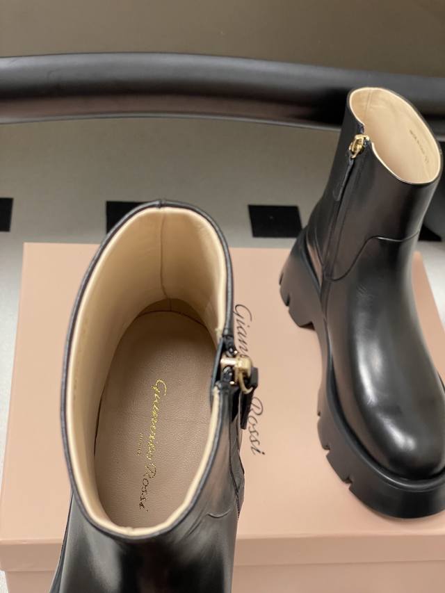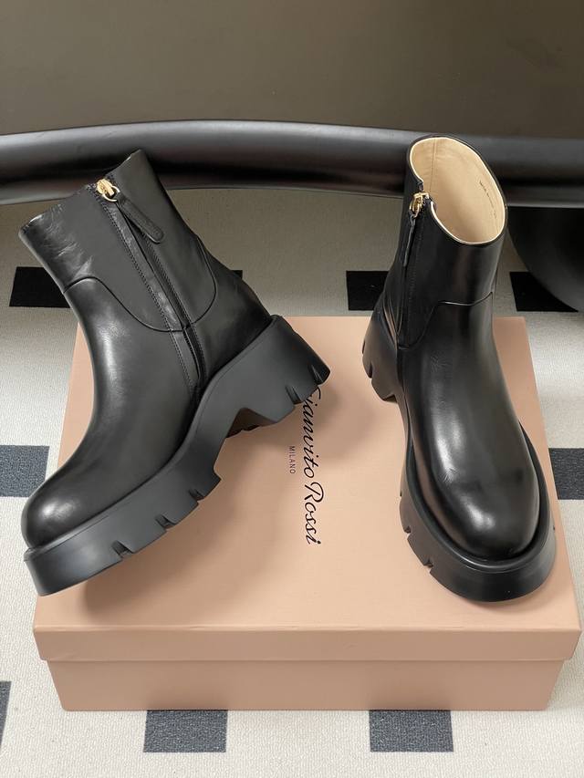 顶级品质 DDD Gianvito Rossi25S秋冬新款 罗西 Gr厚底短靴侧拉链及踝靴增高松糕底靴子 DDD 这双短靴融合了复古工装风与现代奢华感,厚底设计既带有复古腔调,又能巧妙修饰腿型,增添时尚气场,属于近几年很流行的“厚底靴 Chunky Boot ”风格,既百搭又具个性。 DDD 鞋面采用小牛皮,从光泽度和质感来看,皮革细腻柔软,不仅保证了穿着的舒适度,也让鞋子更具高级感与耐用性;鞋底的橡胶材质看起来厚实且有韧性,纹路设计也增强了防滑性与视觉上的力量感。 DDD 鞋底有一定的厚度和层次感,不