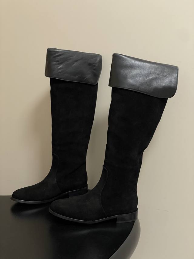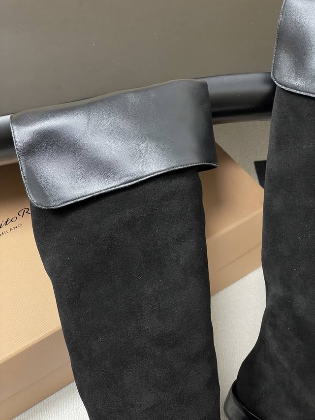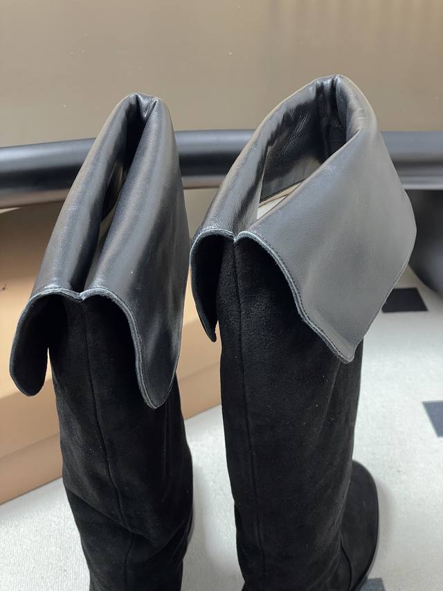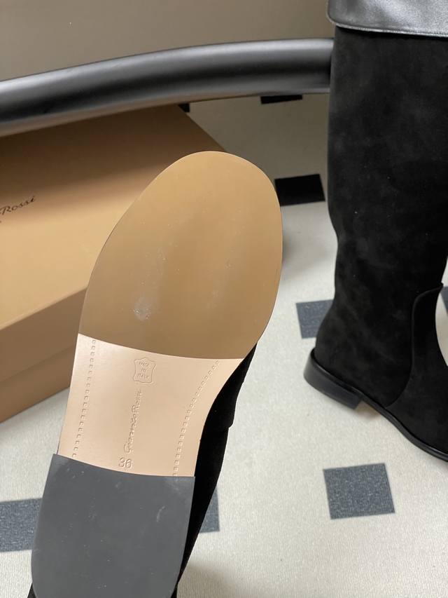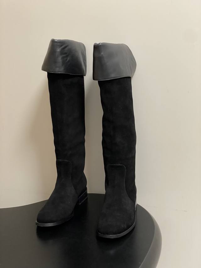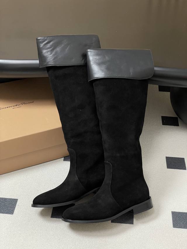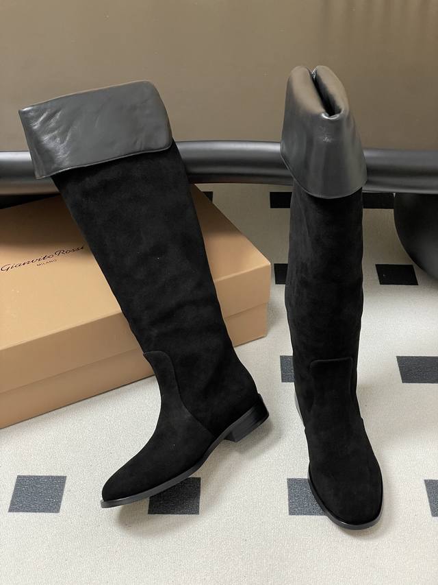 顶级品质 DDD Gianvito Rossi25S秋冬新款 罗西 Gr 复古麂皮绒面堆堆长靴老钱风过膝长筒靴翻口长靴 DDD 采用绒面革材质,质感细腻,呈现出高级的哑光效果,且不同颜色的绒面革在视觉和触觉上都极具质感。高跟长靴,靴筒较高,能够很好地修饰腿部线条;鞋跟为粗跟设计,兼具稳定性与时尚感,提升气场的同时也保证了行走的舒适度。 DDD 鞋头为方头设计,简约大气,符合当下的时尚潮流,同时也能容纳不同脚型;整体设计简约利落,没有过多繁杂的装饰,凸显出经典与优雅的风格,易于搭配各种服饰,无论是裙装还是裤