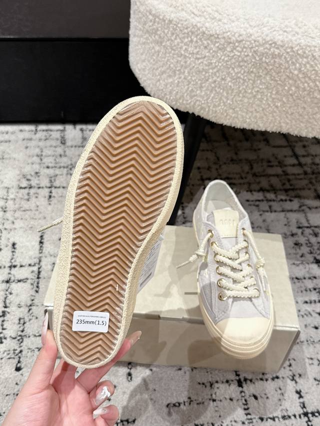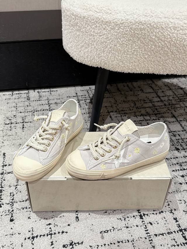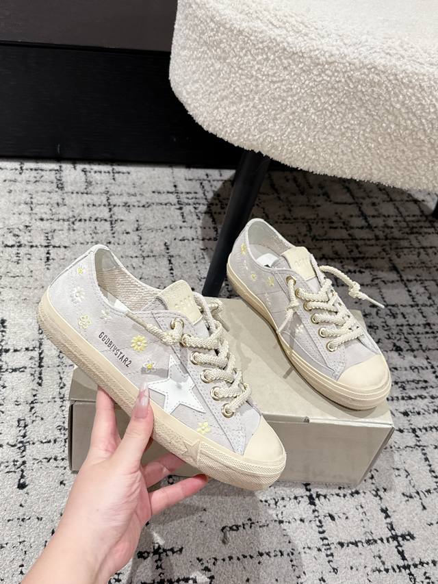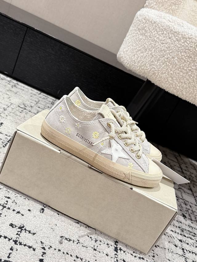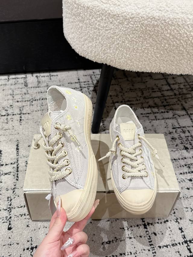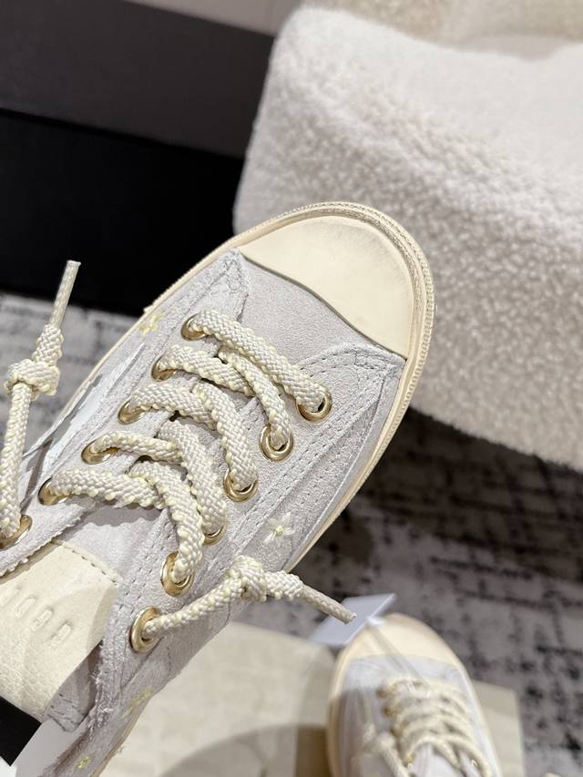 顶级版本 DDD Ggdb 25 最新 做旧款小雏菊厚底板鞋运动鞋 DDD 采用麂皮与帆布拼接材质,质感层次丰富,自带复古做旧氛围。鞋带是编织绳款式,搭配金属扣眼,细节设计更显精致。整体是浅色系调,配色清新柔和,适配多种风格穿搭 DDD 鞋型是经典板鞋款,脚感舒适轻便,日常出行或休闲场合都合适。鞋身点缀小雏菊装饰元素,简约中带点俏皮感,不单调。 DDD 鞋面:牛反绒 DDD 内里:牛皮 DDD 大底:原版开模大底 DDD 增高:4Cm DDD Size : #35-40 DDD