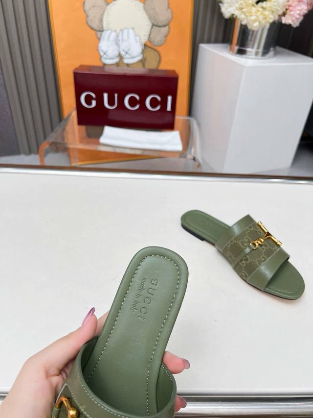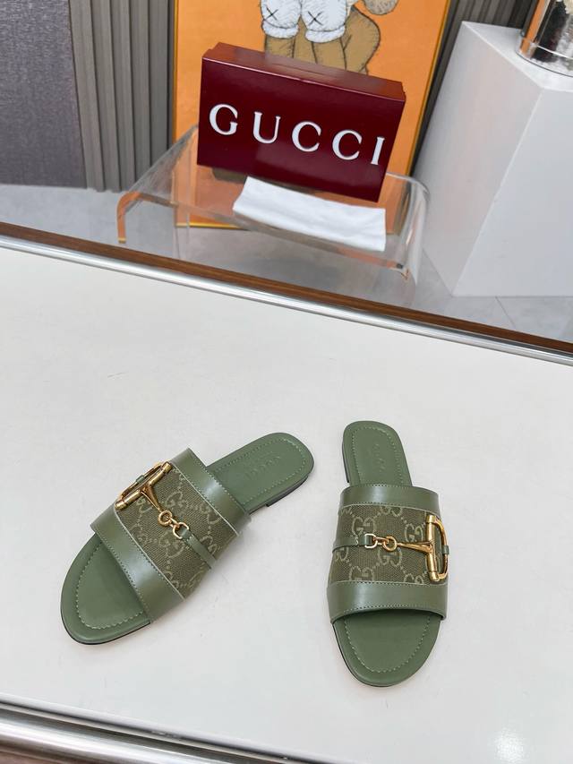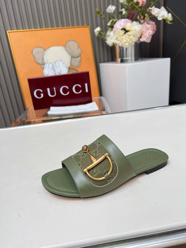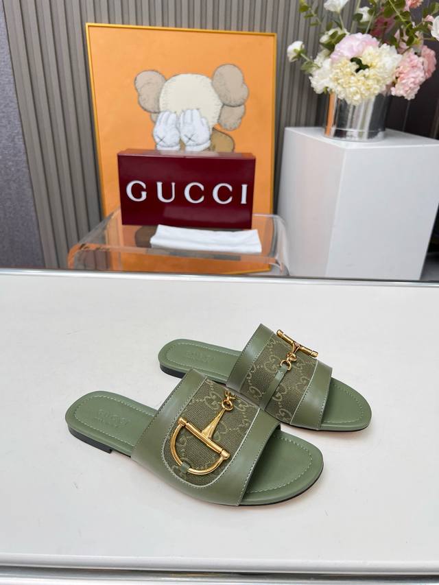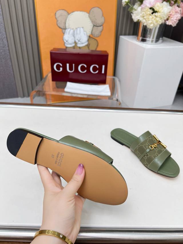 / 5169一106 G U C C I 最新爆款平跟凉鞋 专柜原版鞋开模制作。 原版五金饰扣 大牌明星最爱的奢侈品 多种经典颜色供选 面料:小牛皮配古奇经典老花布