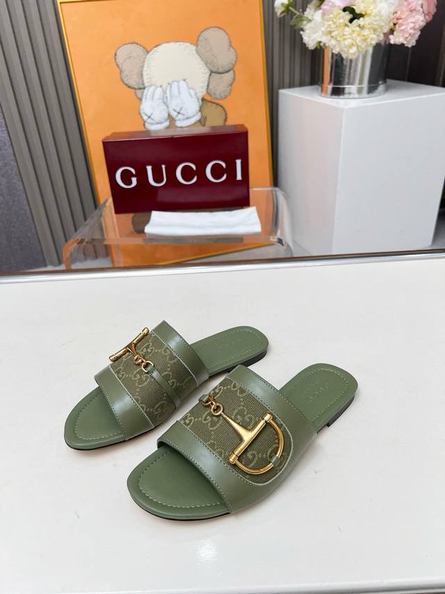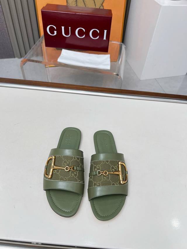 5169一106 G U C C I 最新爆款平跟凉鞋 专柜原版鞋开模制作。 原版五金饰扣 大牌明星最爱的奢侈品 多种经典颜色供选 面料:小牛皮配古奇经典老花布