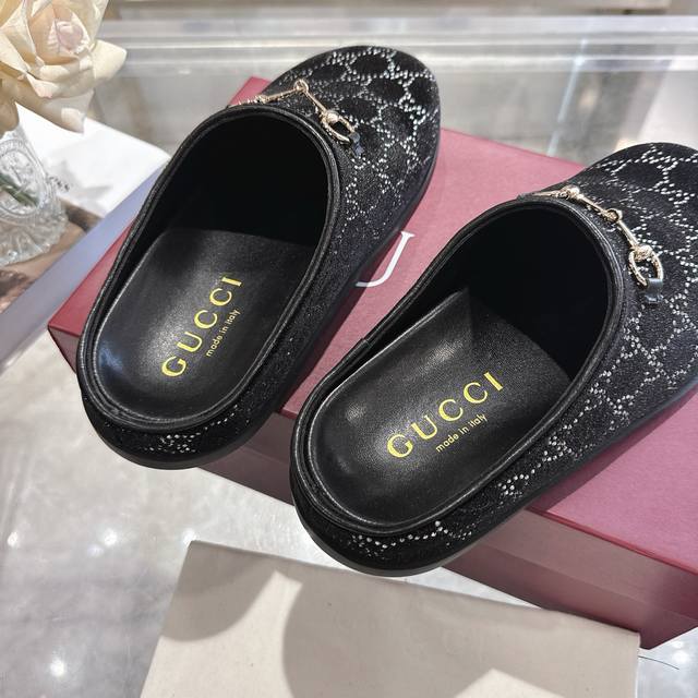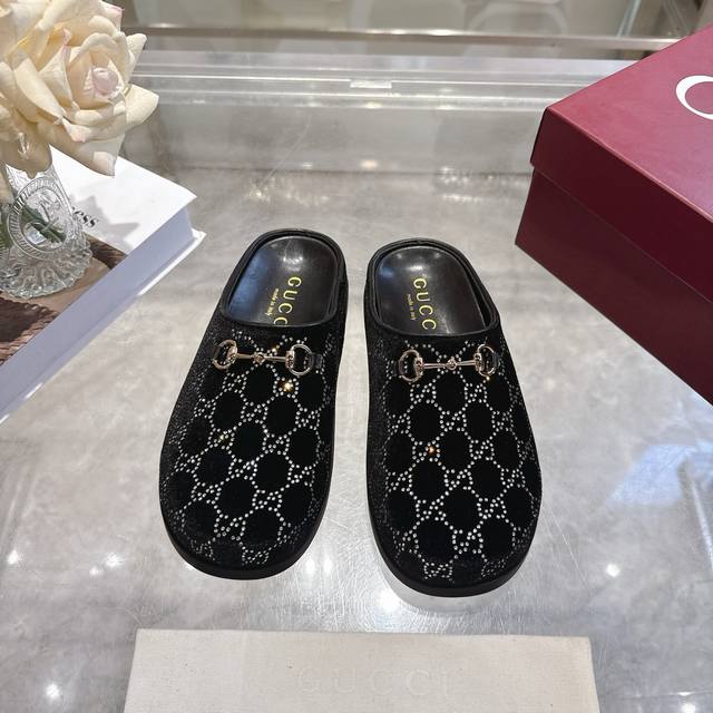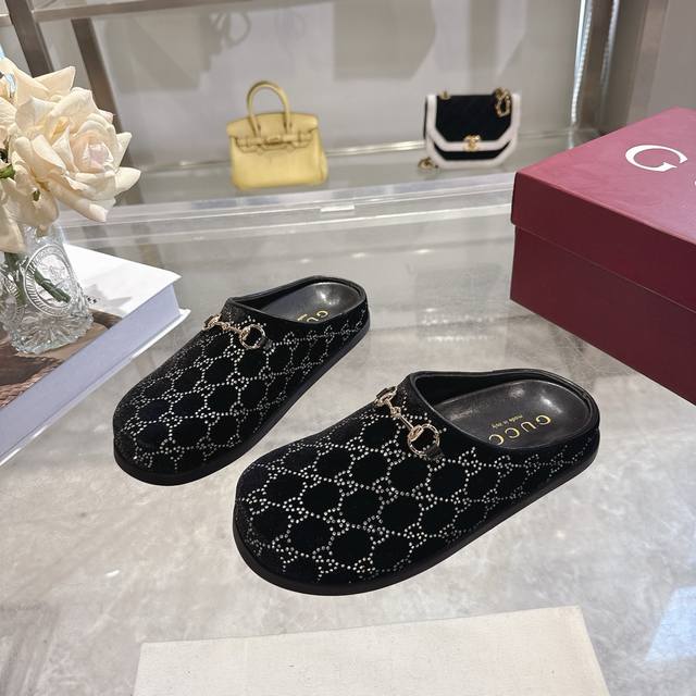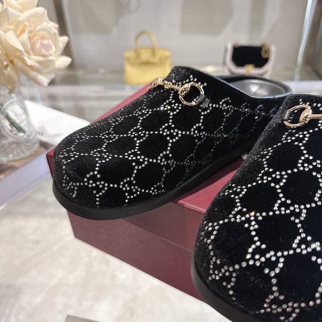 工厂p价 女装女鞋 运动原单 女士新款Gg水晶马衔扣穆勒鞋 这款女士穆勒鞋以马衔扣装饰,彰显品牌源自马术的悠久传统。浅金色细节更添精致,柔软的天鹅绒鞋面饰以Gg