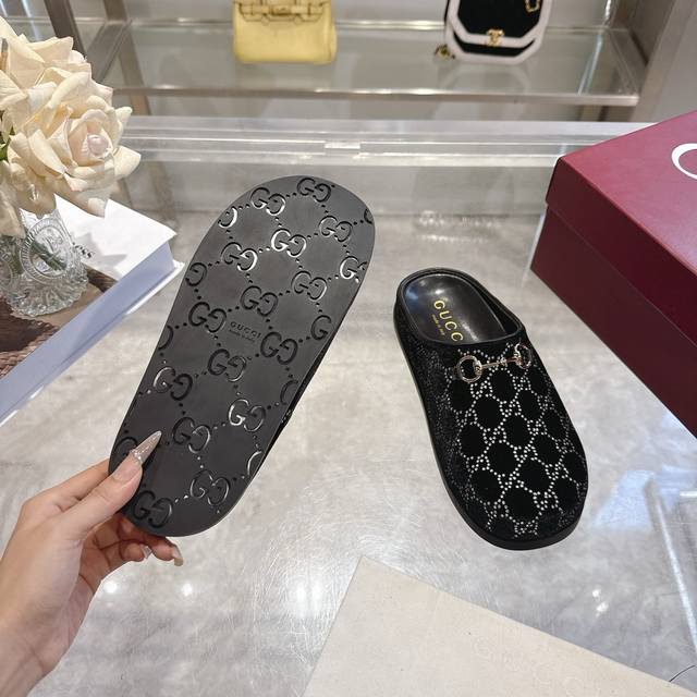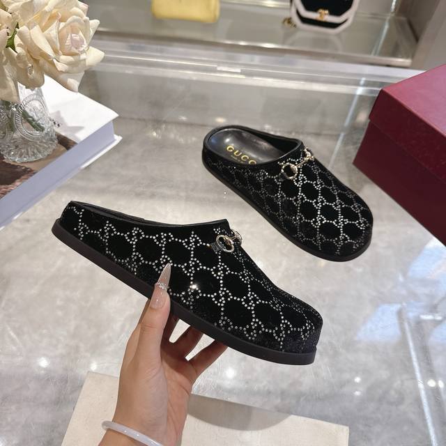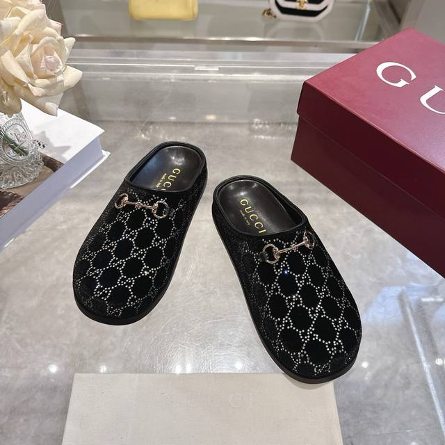 / 工厂p价 女装女鞋 运动原单 女士新款Gg水晶马衔扣穆勒鞋 这款女士穆勒鞋以马衔扣装饰,彰显品牌源自马术的悠久传统。浅金色细节更添精致,柔软的天鹅绒鞋面饰以Gg