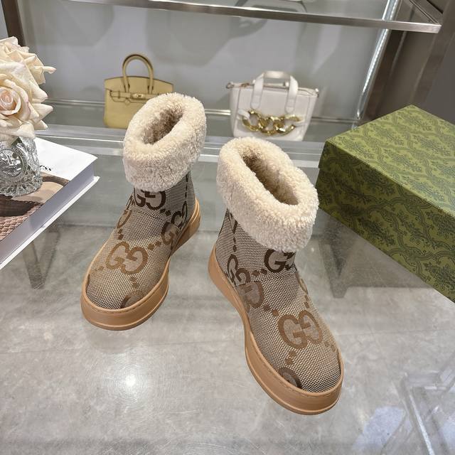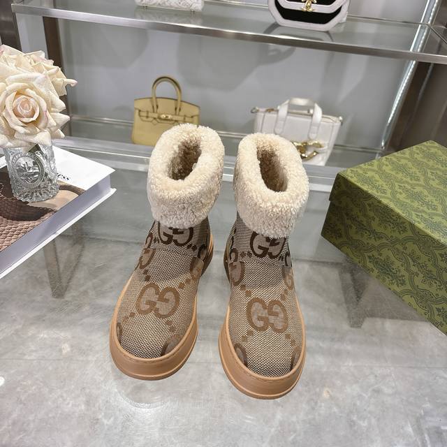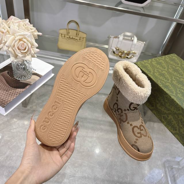 / 爆款 Gg新款女士美利奴羊毛内里靴 这款女士靴采用麂皮精制而成,兼具舒适感与经典传承。柔软的美利奴羊毛内衬带来温暖奢华的穿着体验,而标志性的Gg橡胶鞋底则以品牌