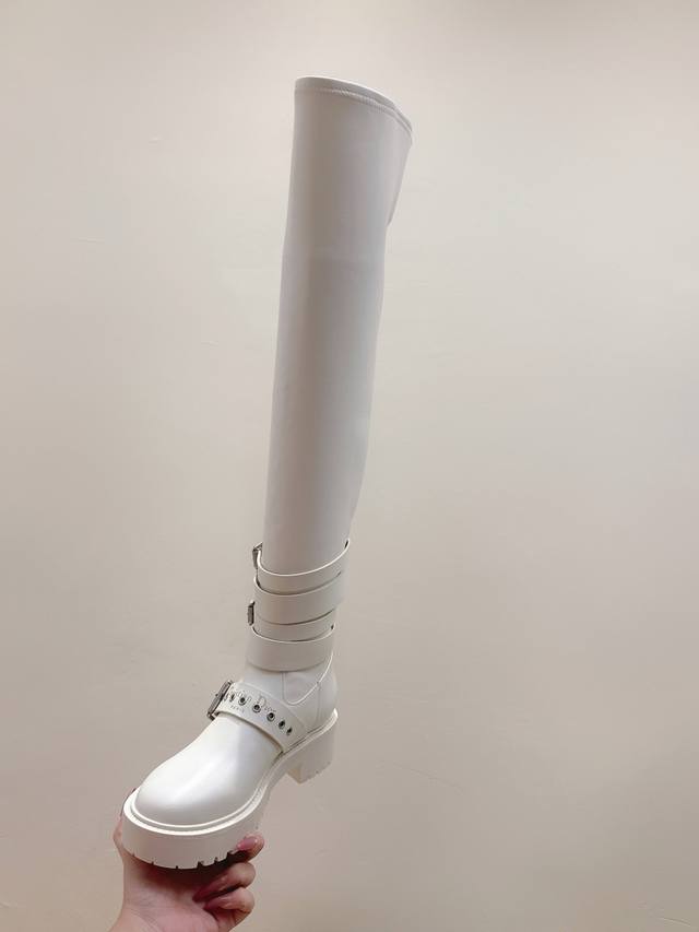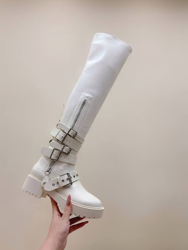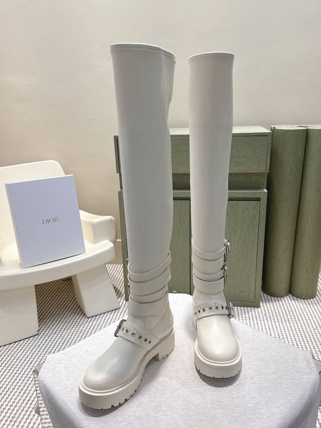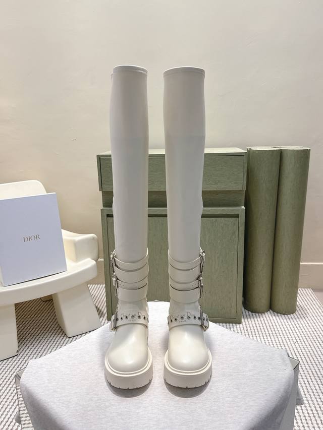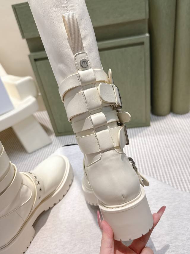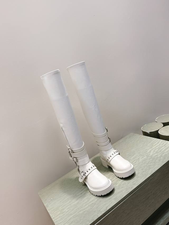 代购级 Dior排扣骑士长靴,黑色牛皮革+金属扣饰,朋克风满满!多层绑带+铆钉细节,线条利落,厚底设计增高显腿长,秋冬穿搭超有气场。靴筒过膝,修饰腿型,搭配短裙