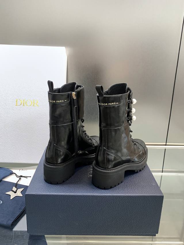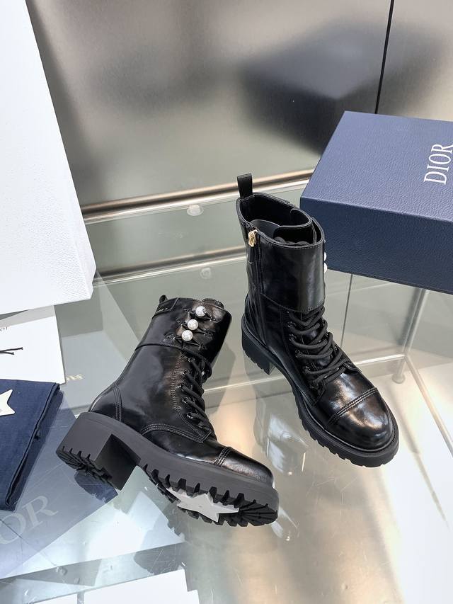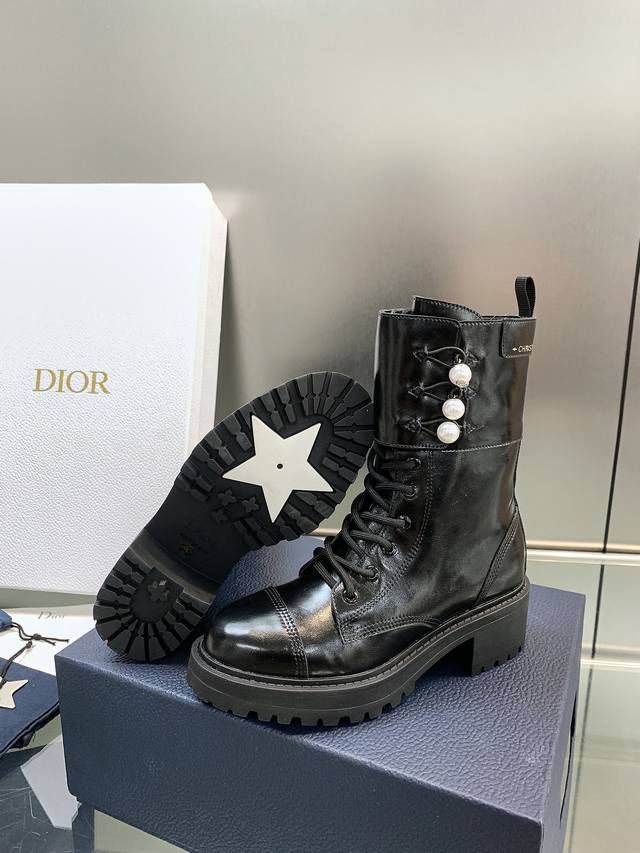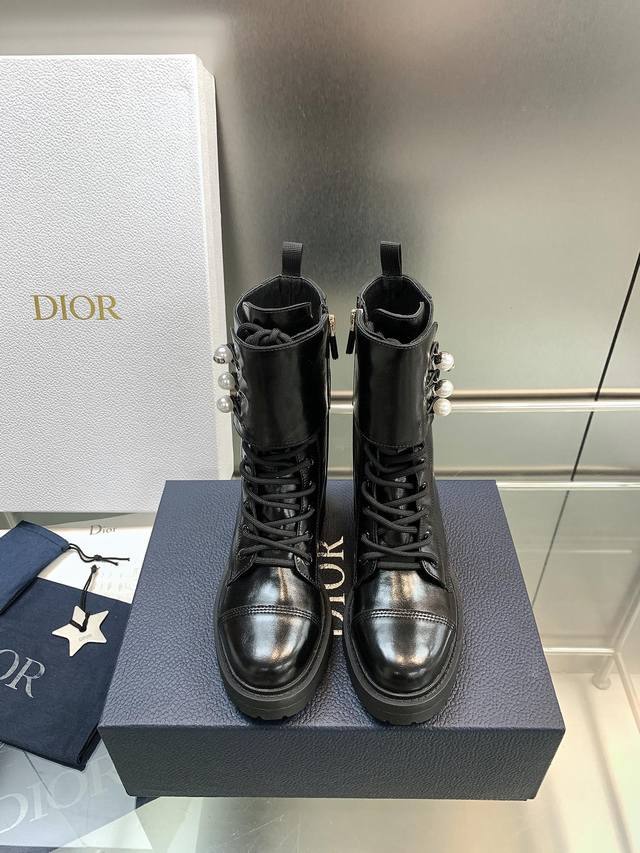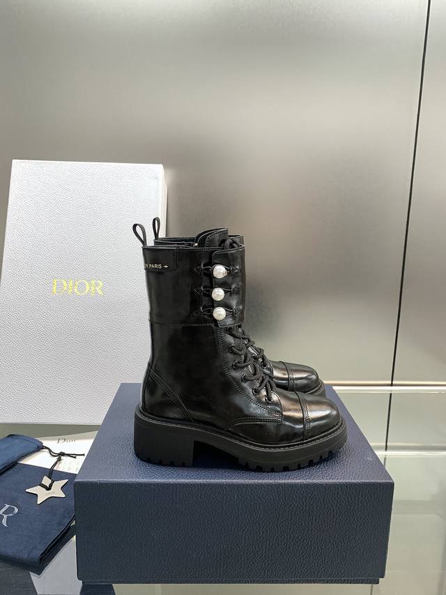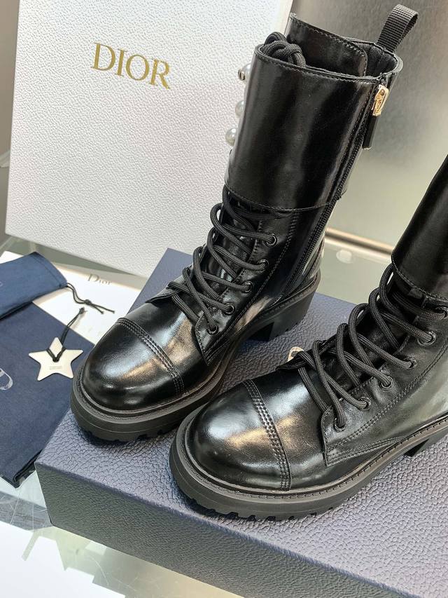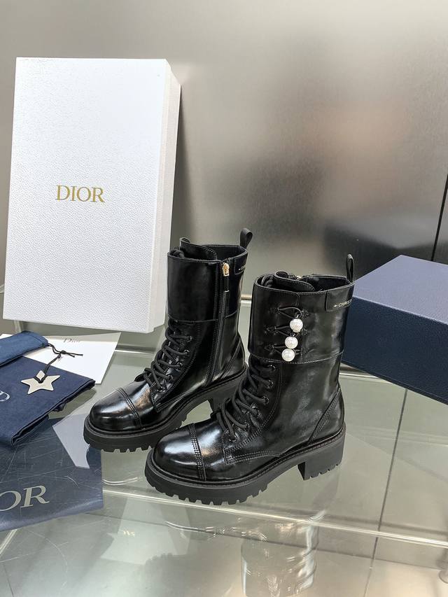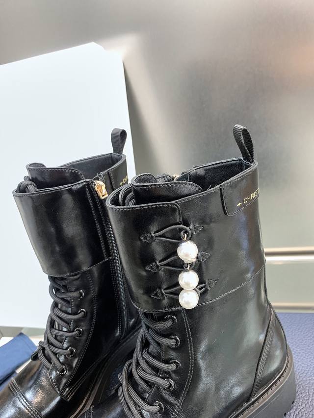 / 出厂价pp: Dior 迪奥 秋冬新款D- Strike系列朋克风系带女靴 明星同款Cd字母Logo珍珠五金扣机车靴 厚底圆头一脚蹬骑士短靴 鞋面:材质:鞋面进