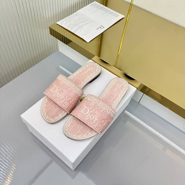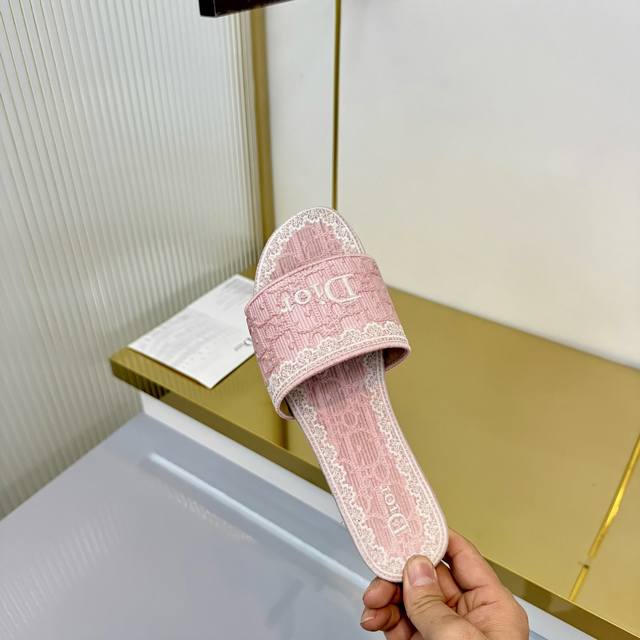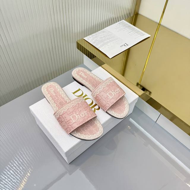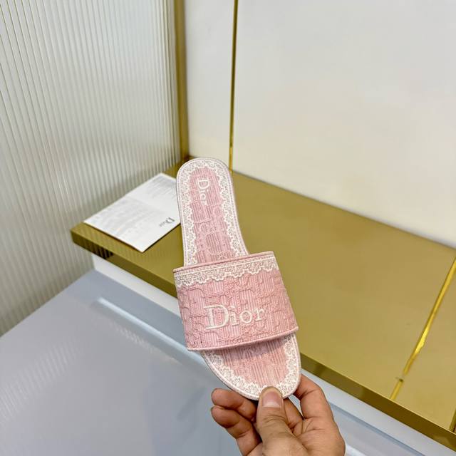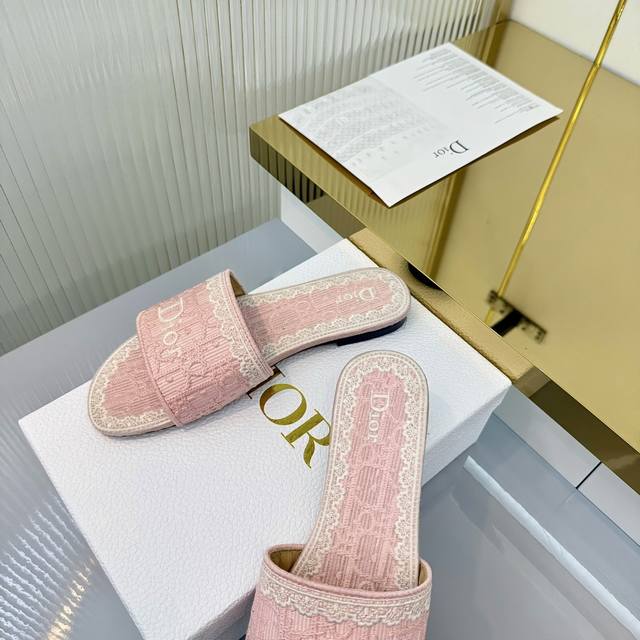 出厂价pp: Ddd Dior 2026春夏系列中跟拖鞋,精致优雅。鞋面5D设计,Dior标志超有辨识度,日常或度假都能轻松驾驭。Oblique压纹是Dior经典元素,搭配蕾丝刺绣,法式浪漫氛围感拉满!鞋底轻便,长时间穿也不累,实用又时髦,是春夏必入单品~ DDD 面料: 蕾丝5D 电秀。 Ddd 鞋底: 意大利 真皮底 Ddd Size: #35-41 40.41订做 DDD