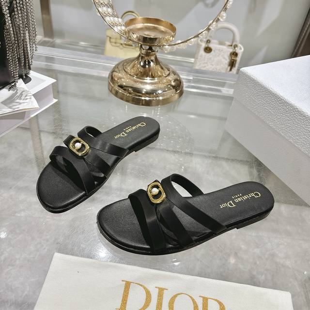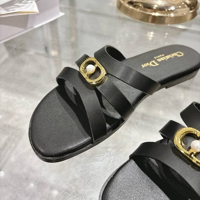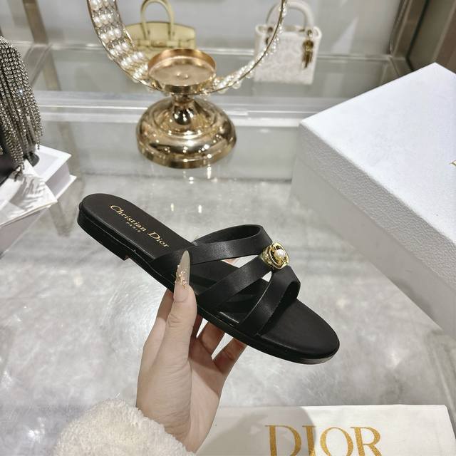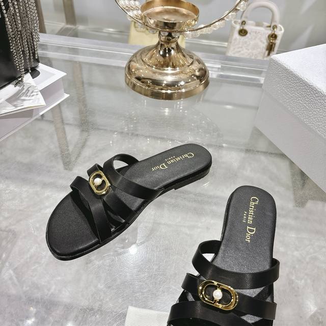 橙子出厂价p dior 迪奥春夏新款 珍珠刺绣平底拖鞋 休闲凉拖 一字拖 码数 35-42