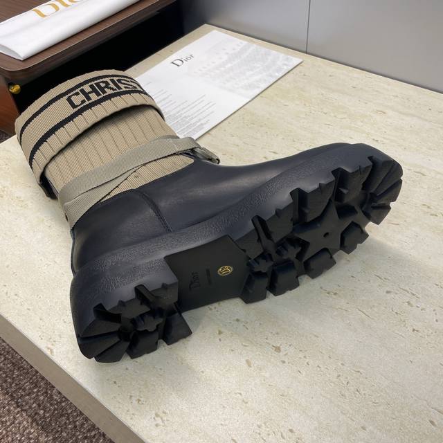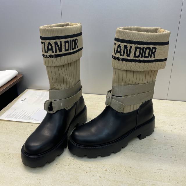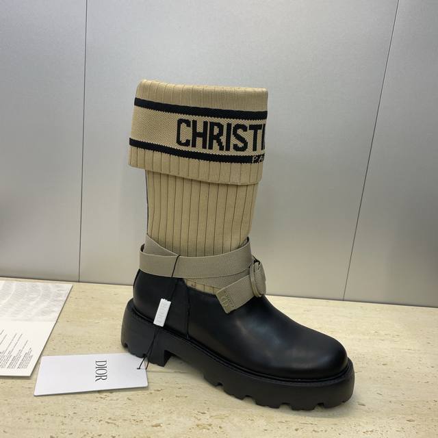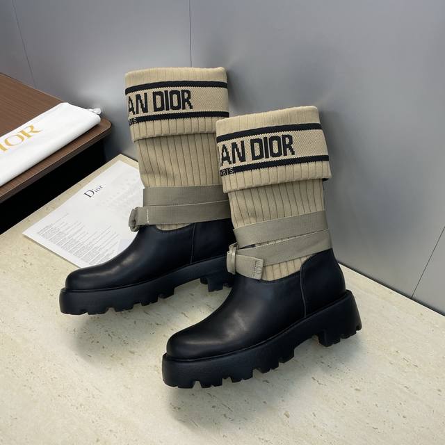 / 工厂p价p Dior 迪奥 Cd 2025秋冬新款高定海报款D-Major电绣拼色字母Logo圆头弹力毛线筒女短靴 明星同款低跟一脚蹬骑士军靴 材质:鞋面进口小