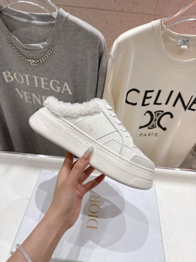 市场高版本 厚底 DDD Dior Star 迪奥D家F037 2025Ss秋冬新款半拖厚底羊毛里休闲鞋小白鞋 DDD 延续经久不衰的轮廓,是新款经典单品。采用白色牛皮革精心制作,饰以同色调绒面革镶片。点缀以“Cd”和“Christian Dio* paris”标志,金属星星装饰鞋带孔眼,提升格调。款式轻盈,搭配“Christian Dio*”标志鞋底,四季皆宜,可与各式休闲造型搭配,增添点睛之笔。 DDD 鞋舌饰以“Christian Dior paris”标志 DDD 侧面饰以“Cd”标志和黑色星星
