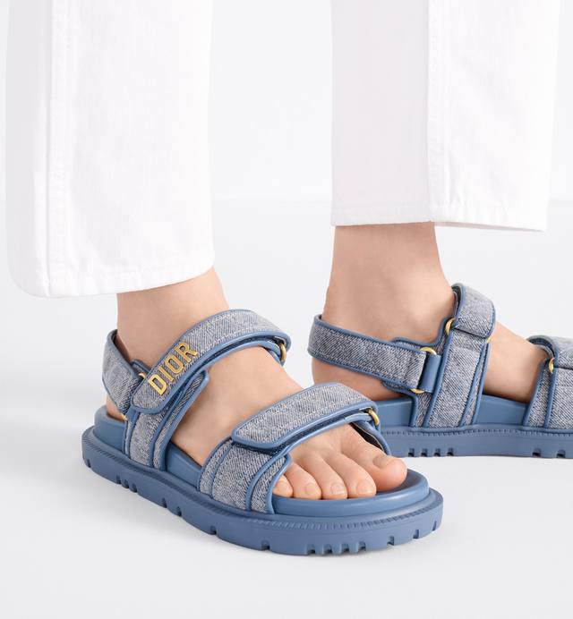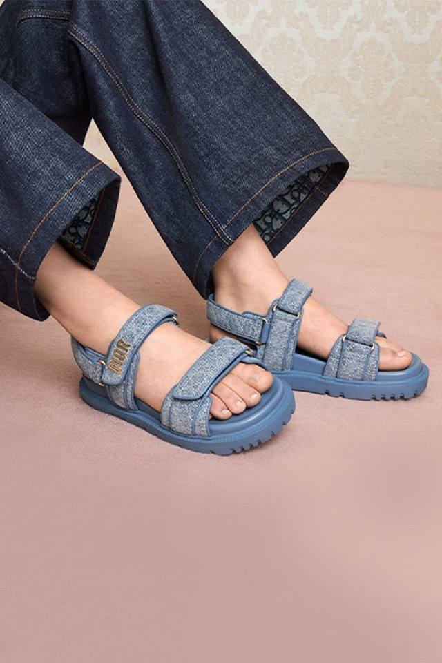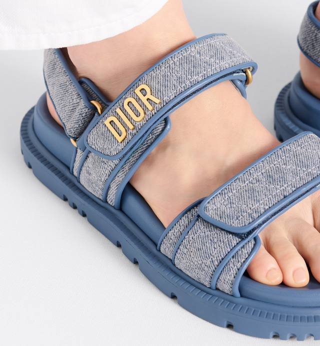 / 牛仔蓝色藤格纹 Dior 最新款凉鞋 这款混种羊皮 Dioract 凉鞋款式时尚。搭配贴合脚型的内底,采用格外轻盈、舒适的皮革制作。鞋面饰带采用魔术贴开合,搭配