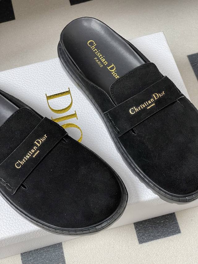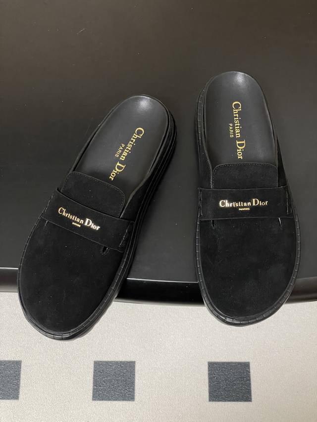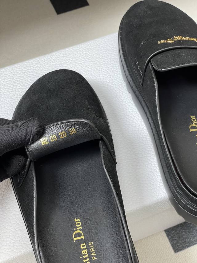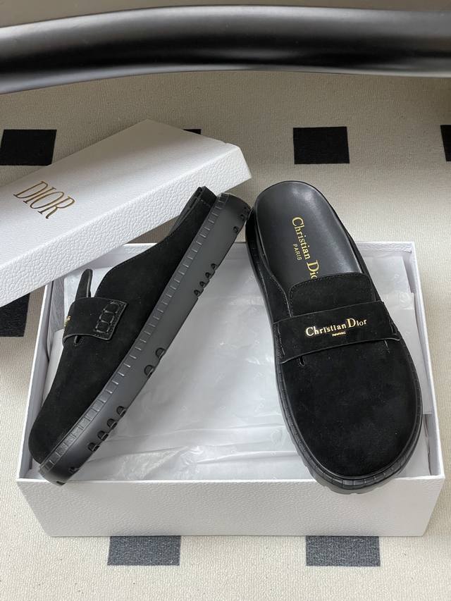 FFF 码数:35-39 40.41定做不退换 DDD 26Ss春夏新款Dior迪奥D-Boy穆勒鞋 包头平底半拖鞋Cd字母五金扣厚底休闲拖鞋 DDD 这款Dior Boy穆勒鞋是二零二六早春成衣系列新品,将木底鞋的休闲廓形与Dior的高订风格经典标识巧妙结合。采用绳米色 黑色绒面牛皮革精心制作,搭配圆形鞋头,鞋面点缀以金色调Christian Dior Paris标志提升格调。厚实的同色调凹口鞋底设计,时尚舒适。 DDD 鞋面:定制高丝光牛反绒 DDD 内里垫脚:羊皮 DDD 鞋底:原版开模橡胶大底 D
