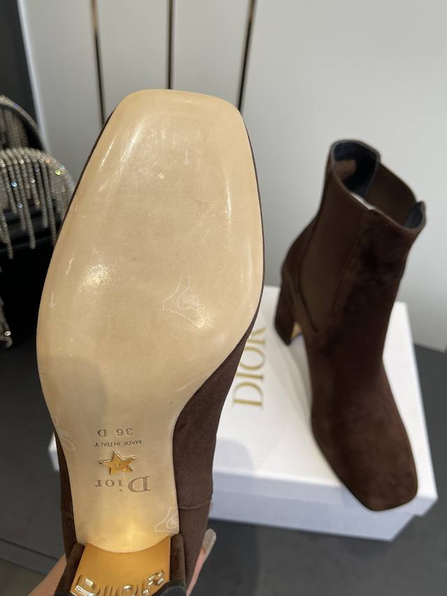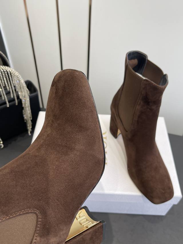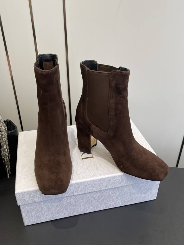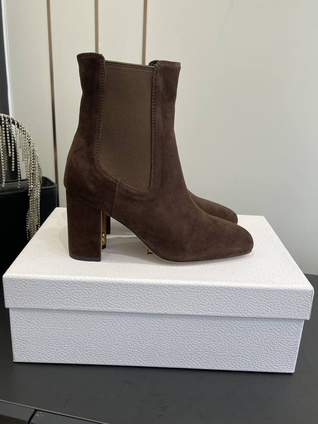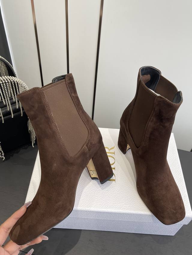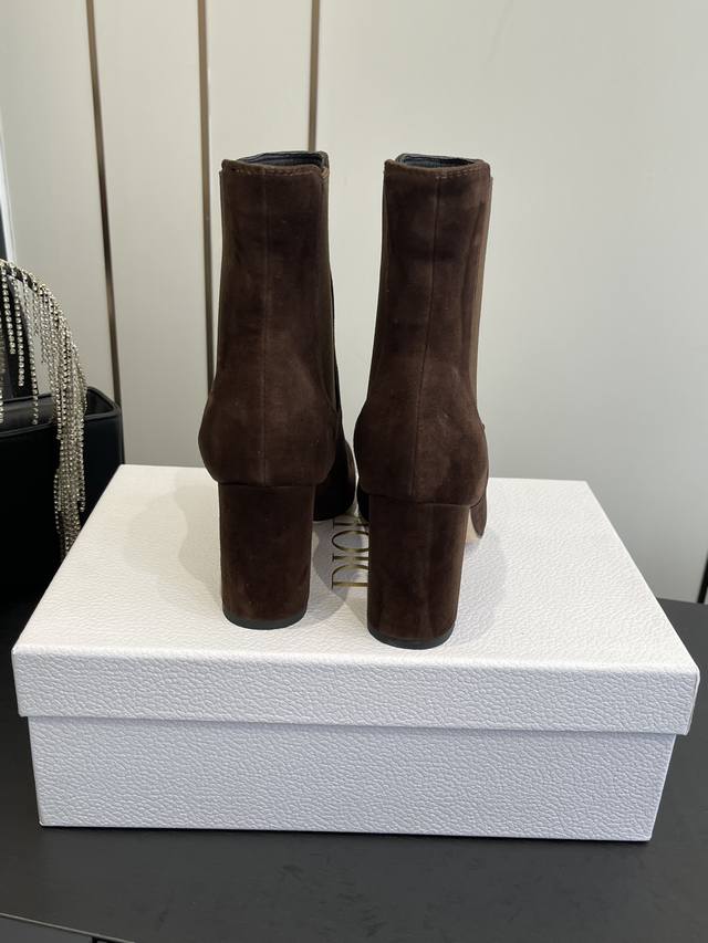 迪奥 秋冬新款 粗跟短靴 这款 D-Shadow高跟套筒靴子 双层松紧 秋冬搭配 8Cm、圆柱形鞋跟和鞋跟品牌特色细节电度片彰显时尚高雅的魅力。 面料混种羊皮+