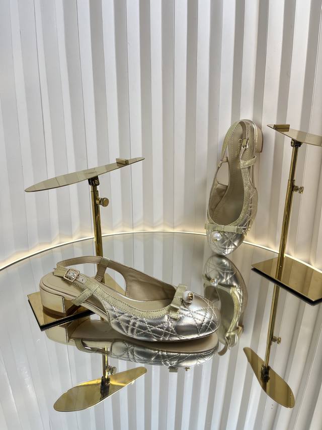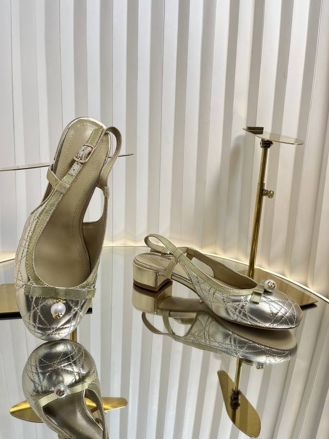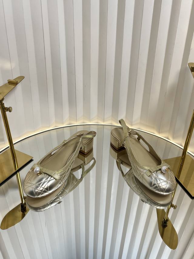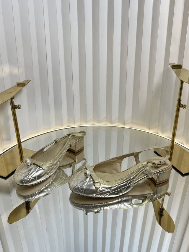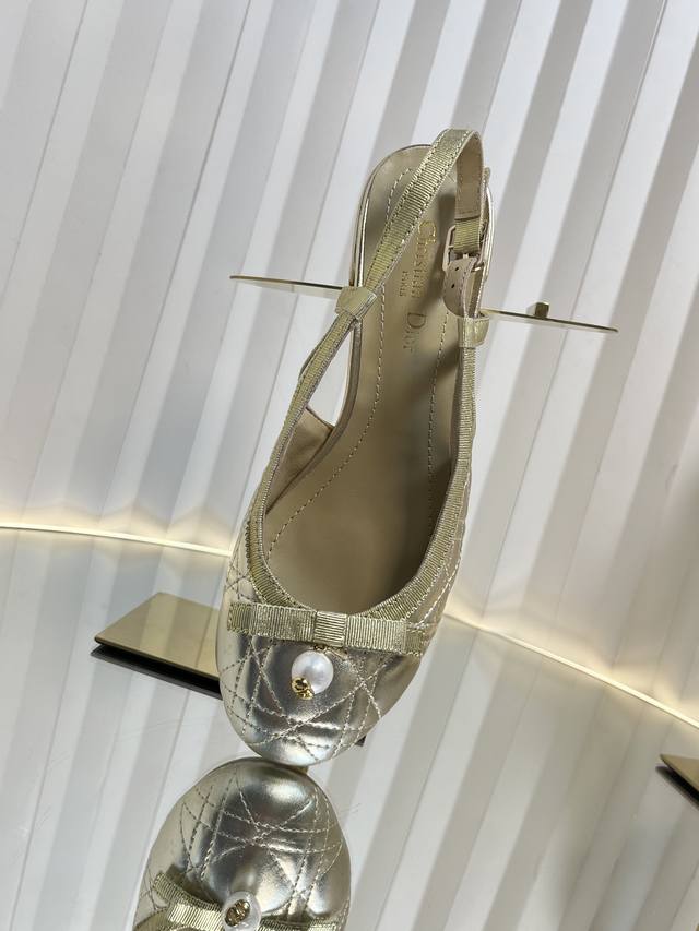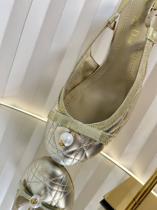 / 迪奥 Dior 2025春夏高定系列新款 Ballet 标志性电绣藤格纹低跟芭蕾舞女鞋 CD字母logo珍珠扣粗跟蝴蝶结凉鞋材质:进口金属羊皮 环保藤格纹粗花呢