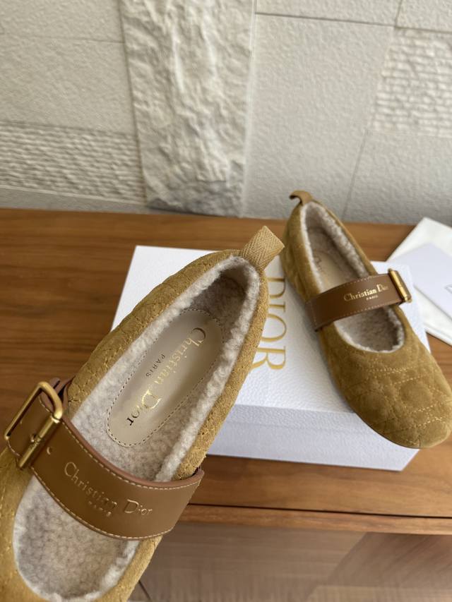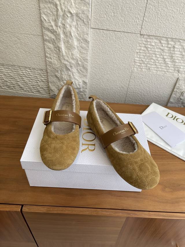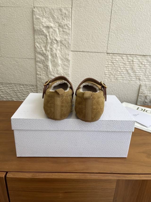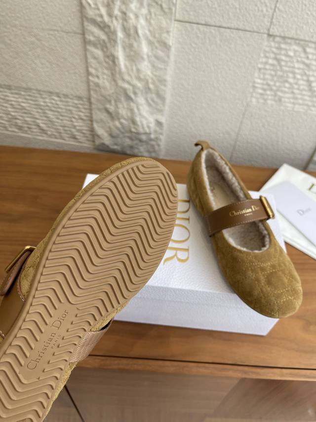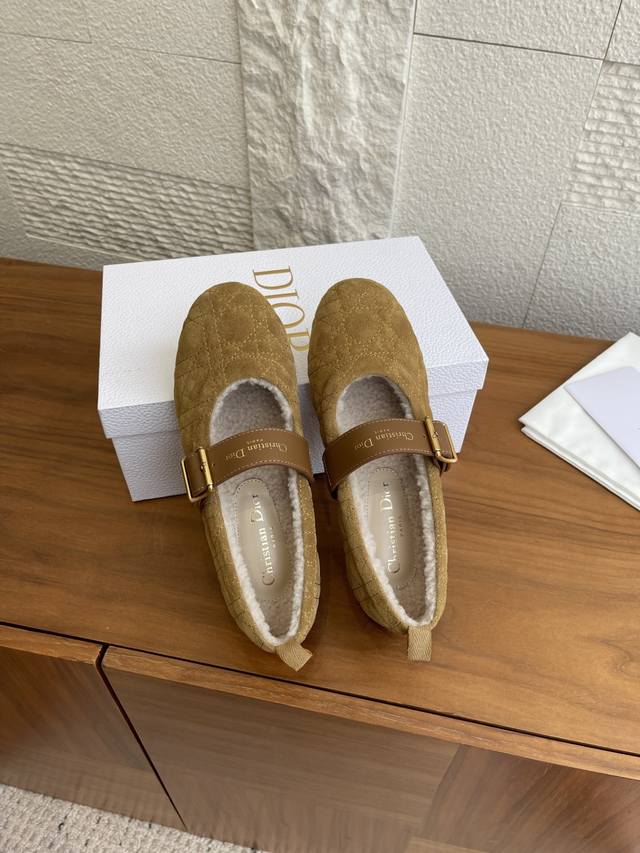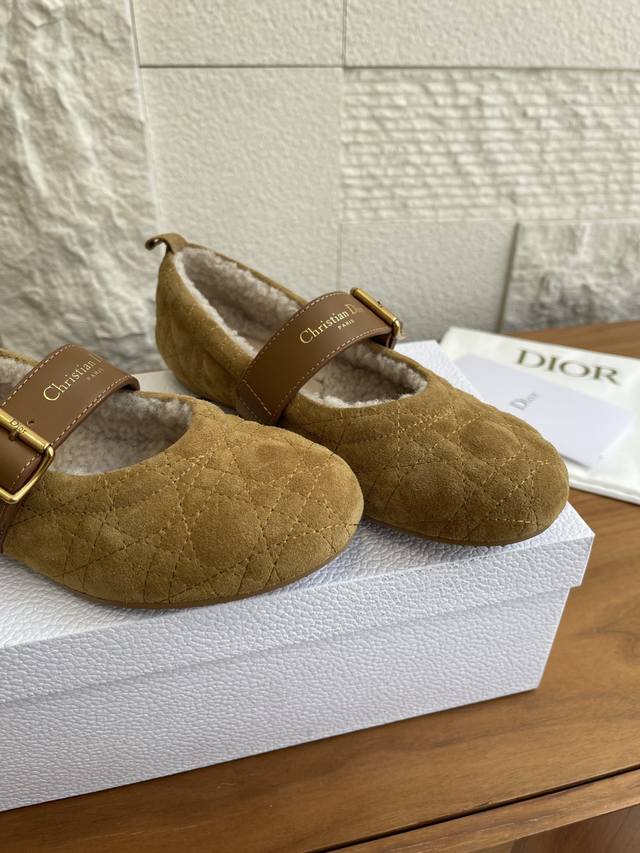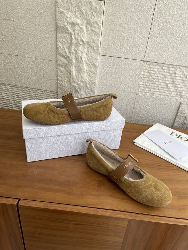 顶级版本: DDD Dior 迪奥 2025 秋冬新款 Dioralps系列 滕格纹 Dior Frost 芭蕾鞋 DDD 这款 Dior Frost 芭蕾鞋来自 Dioralps 限定系列,优雅舒适。黑色绒面牛皮革鞋面饰以藤格纹图案,白色羊皮革皮毛一体里料可打造舒适的穿着体验。可调节黑色牛皮革饰带点缀以金色饰面 Christian Dior paris 标志搭扣,搭配凹口橡胶鞋底更显精致。可与其他 Dioralps 单品搭配。 DDD 面料:进口麂皮 DDD 内里:绵羊毛 DDD 大底:原版开模橡胶大底