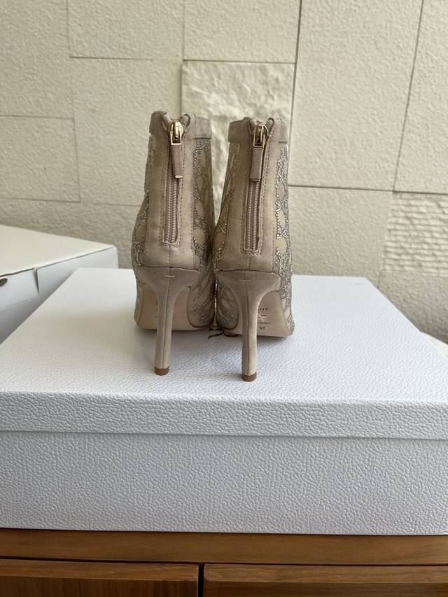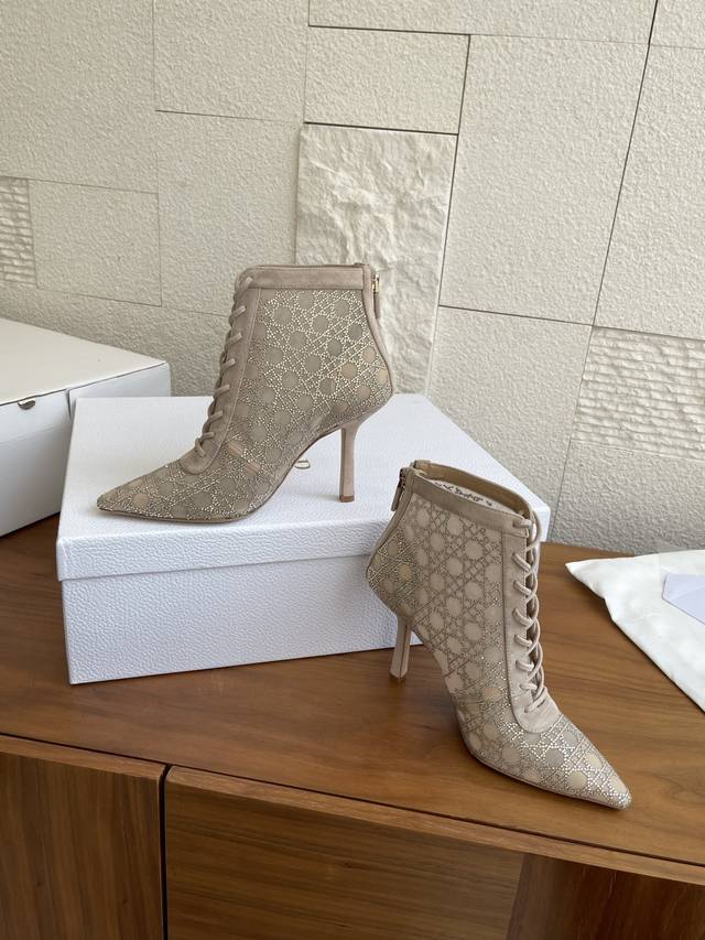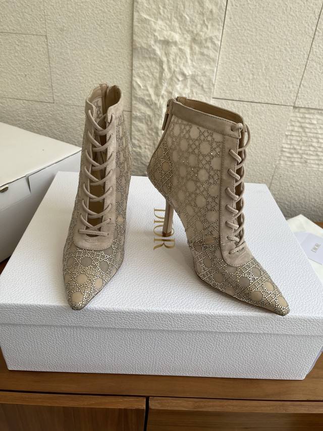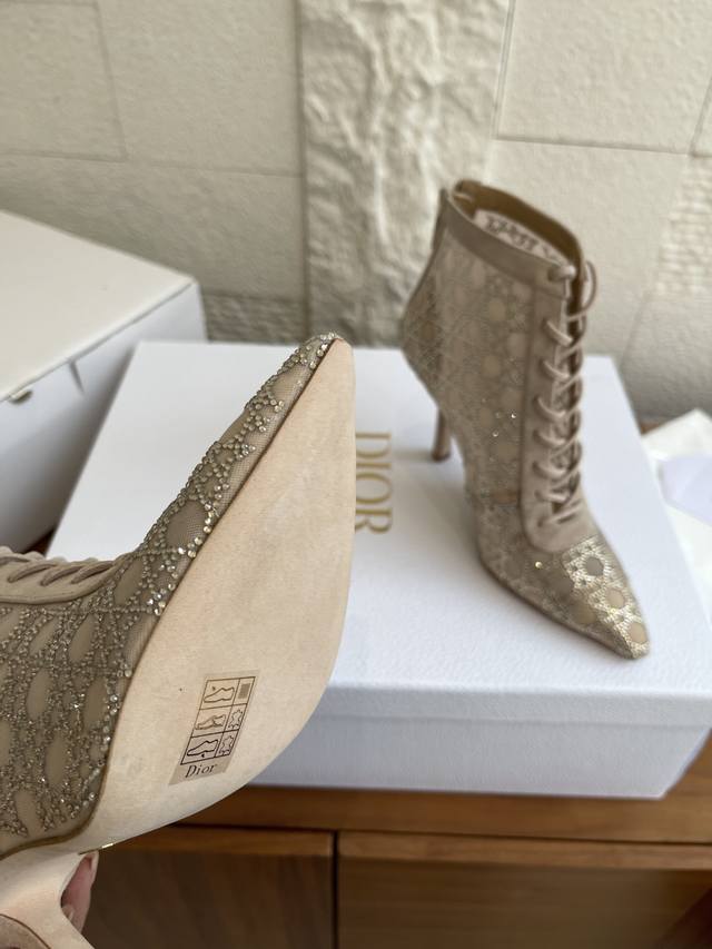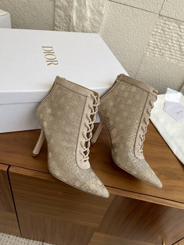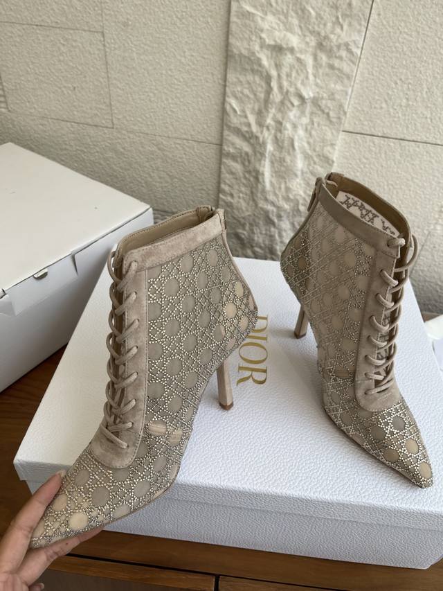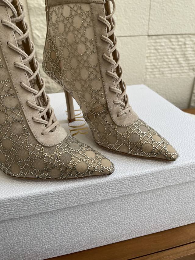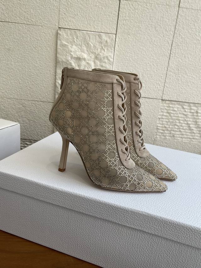 顶级版本: Dior 迪奥 25Ss 秋冬新款 透明网眼 水晶钻 藤格纹图案 后拉链 Cature高跟踝靴 这款Dior Capture 高跟踝靴是一款集现代与优雅于一体的精致作品。它采用精致的透明胶片设计,由网眼制成,银色水钻再现了 Cannage 图案和黑色绒面革山羊皮细节。没有鞋舌产生了穿孔效果,使这款鞋无可挑剔。10厘米的逗号鞋跟完美地完成了这款精致的尖头鞋。 面料:原版定制进口网纱 羊猄 内里:进口山羊皮 大底:意大利进口真皮大底 跟高:10Cm Size: 35-42 40 41 42定做不退
