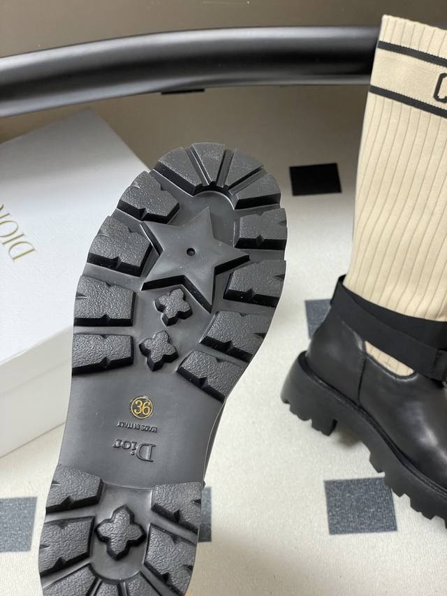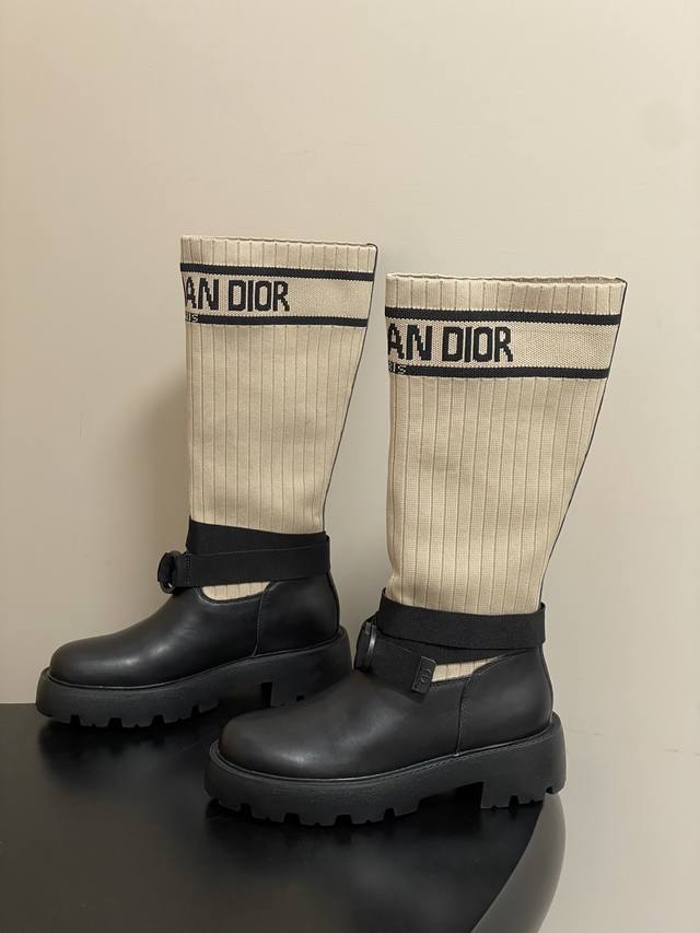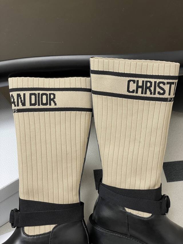 2025秋冬新款Dior迪奥D-Major 中筒靴 爆火Cd字母电绣针织面料长筒骑士靴厚底袜子靴 DDD 这款D-Major 靴子醒目吸睛,彰显个性。黑色牛皮革鞋面搭配同色调科技针织面料袜筒,饰以灵感源自Book Tote 手袋的白色 Christian Dior标志条形图案。可调节饰带突显脚踝线条,厚实而轻盈的凹口鞋底更显精致。 DDD 鞋面:牛皮 定制针织面料 DDD 鞋底:原版开模Eva橡胶大底 DDD 码数:35-39 40.41定做不退换 DDD