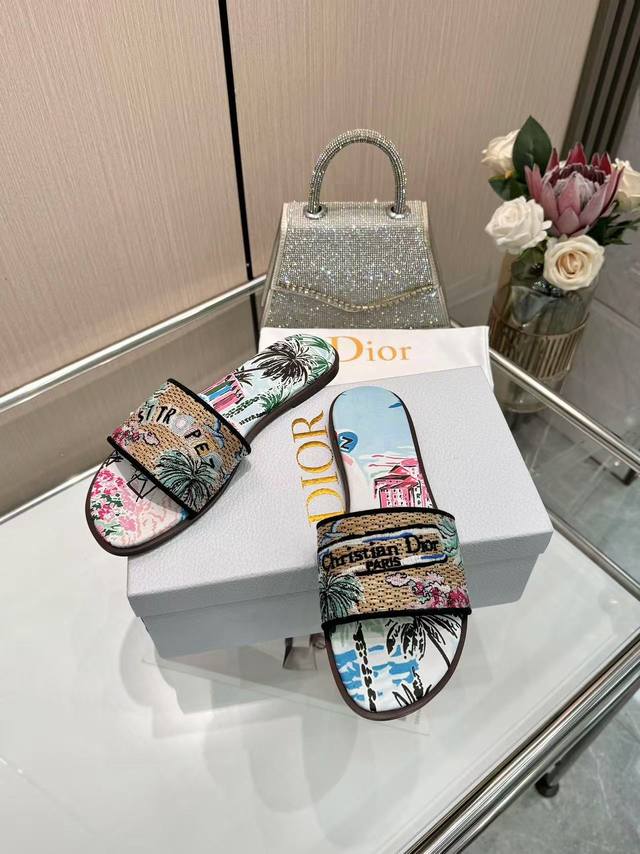 Cd迪奥女士老花刺绣拖鞋,羊皮内里,码数36-43,橡胶底 ,皮底