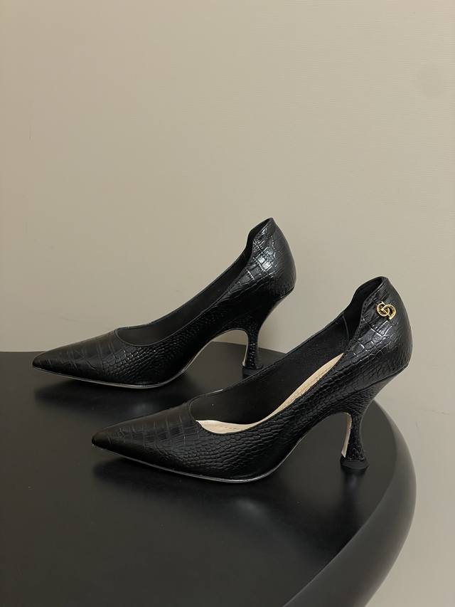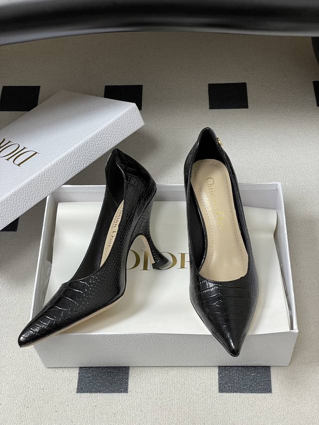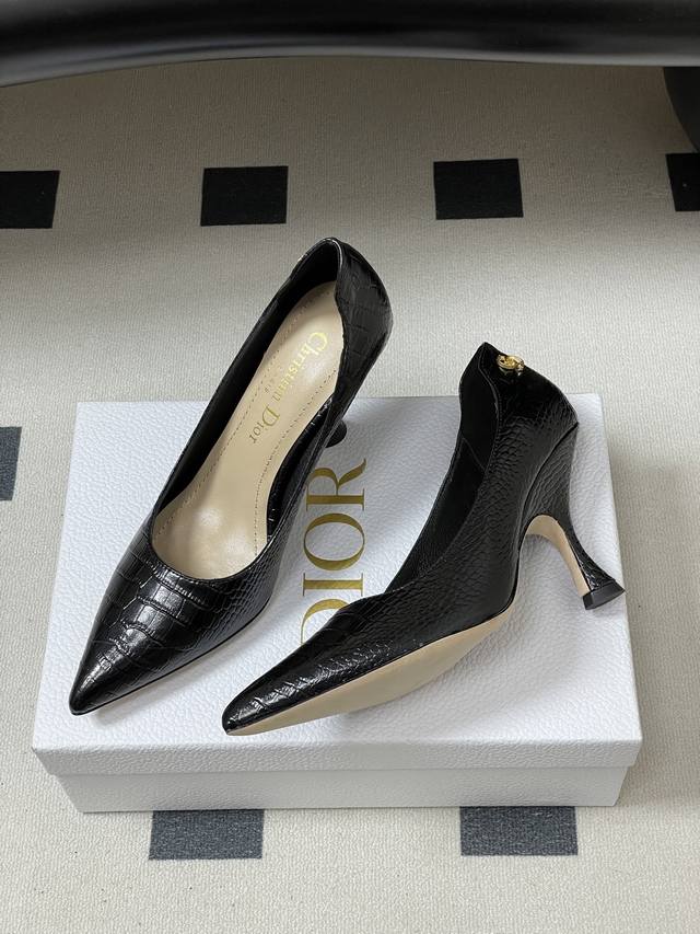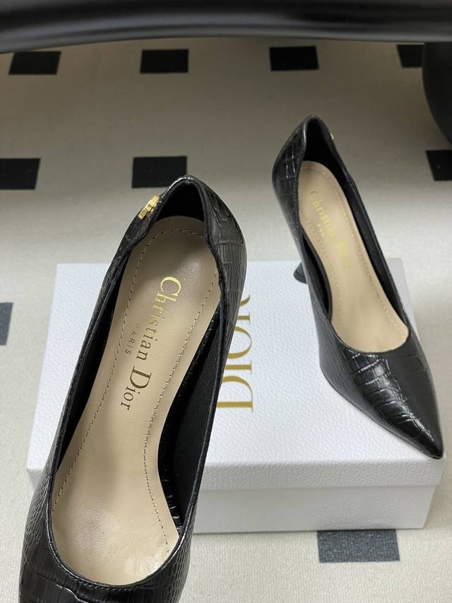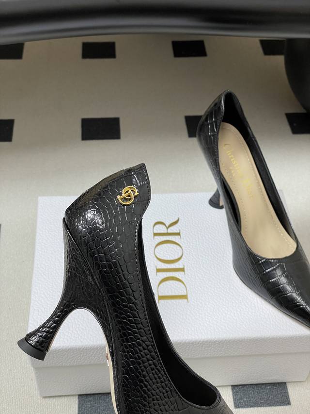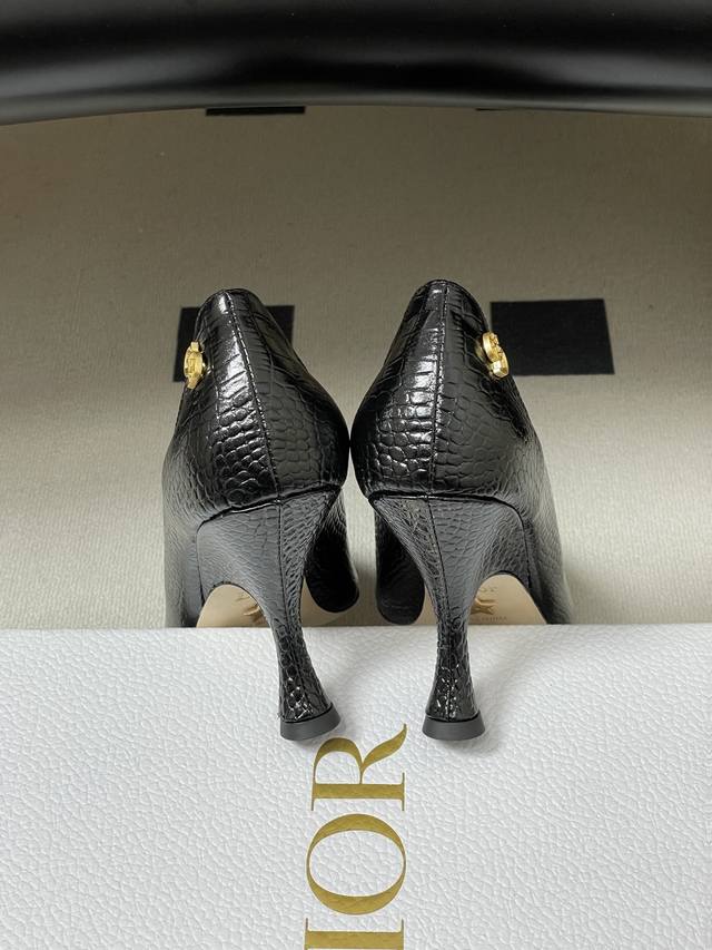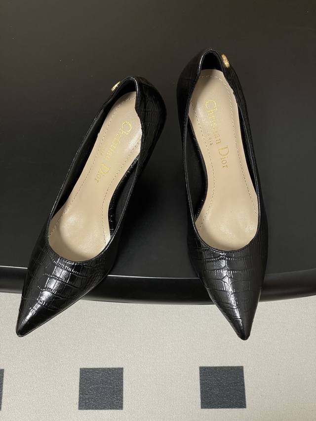 FFF DDD 26Ss春夏新款Dior迪奥最新走秀款Cd字母五金扣鳄鱼纹皮面尖头高跟鞋复古风高跟单鞋 DDD Dior 2026春夏系列高跟鞋,由Jonathan Anderson设计,黑色尖头+金色Cd金属扣,优雅又有现代感。细高跟9.5Cm,修饰腿型,拉长比例,适合职场、宴会等正式场合。鞋面优质皮革,触感柔软,穿着舒适。Cd金属扣是Dior经典标志,彰显品牌历史与创新。整体设计融合经典与玩味,是现代女性气质与自信的象征。 DDD 鞋面:牛皮 羊猄皮 DDD 内里垫脚:羊皮 DDD 鞋底:意大利真皮大